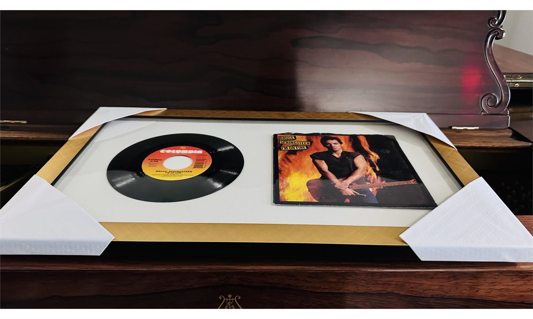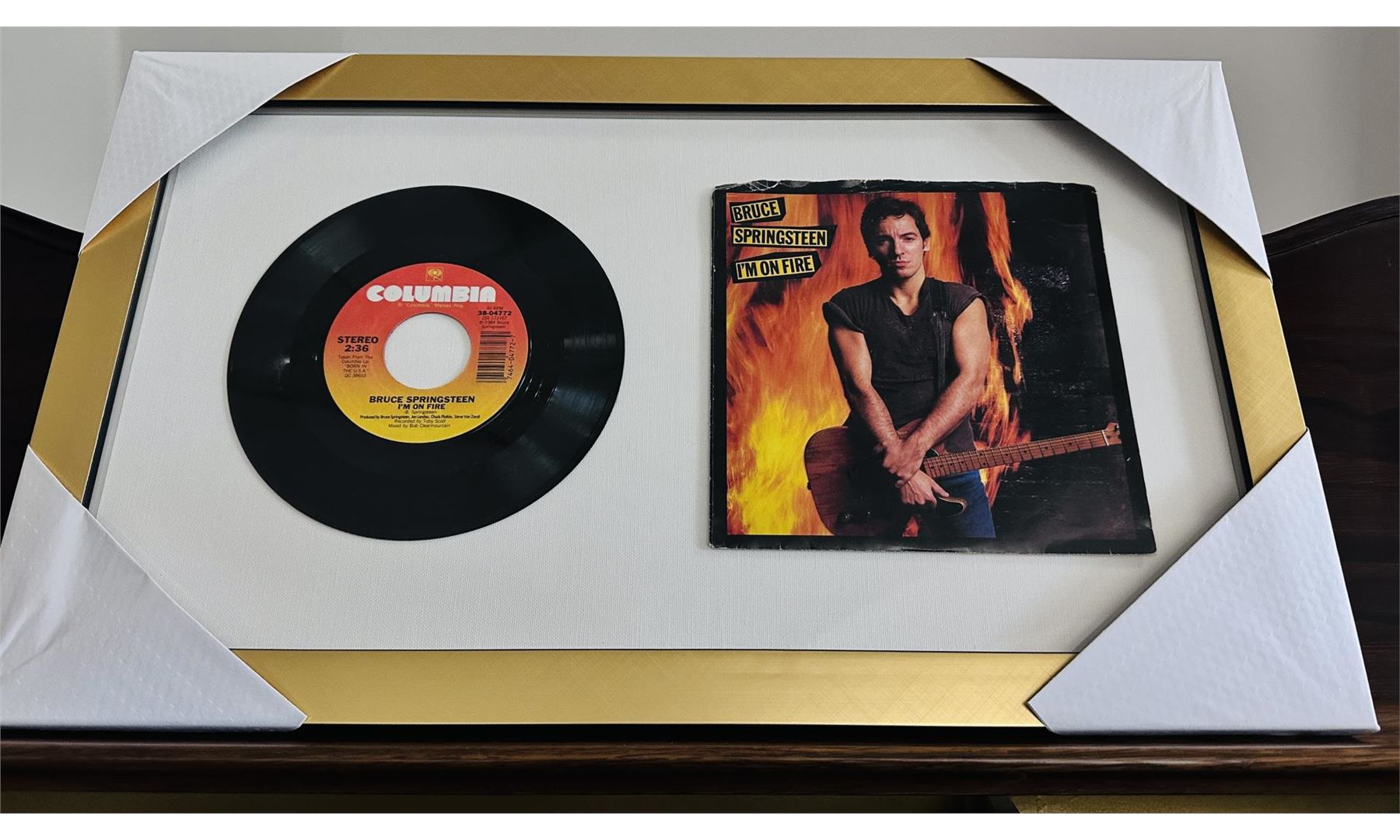 A Collector's Item, an original Issue 45 rpm record of Bruce Springstein's mega-hit "I'm On Fire" & the original record jacket. The frame is 12.5x21" mounted on linen.