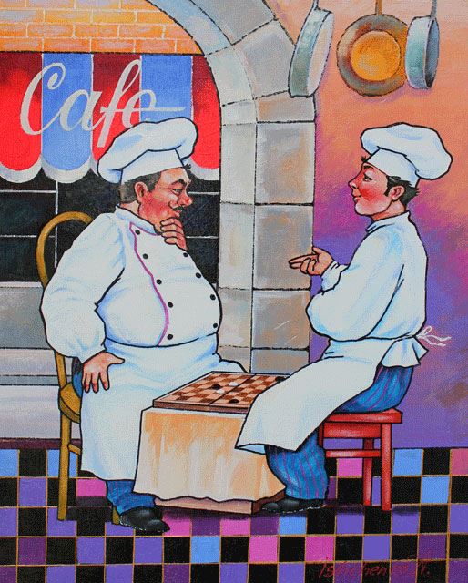Artist: Alexander Ishchenko - Title: Chess Chef II - Medium: Original Acrylic on Canvas - Signature: This one-of-a-kind work is hand-signed by the artist at the bottom of the image - Image Size: Approximately 24 inches x 20 inches - Unframed on Unstretched Canvas - Details: This work comes with a Certificate of Authenticity - Biography: The painting technique and caricature of Ischenko is complex and unique. In his works, he uses acrylic paints on rice paper, where the uniqueness of this method is completely manually processing of the rice paper, before applying the background. The method originally came from hundreds of years ago from countries such as Vietnam, Korea and Japan, where rice paper was then used for art drawing as a primary substitute, instead of the usual paper we are familiar nowadays. -