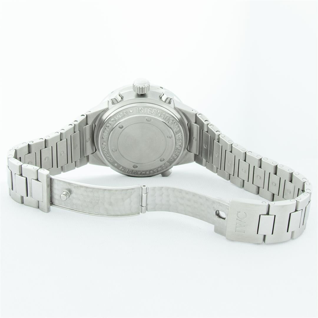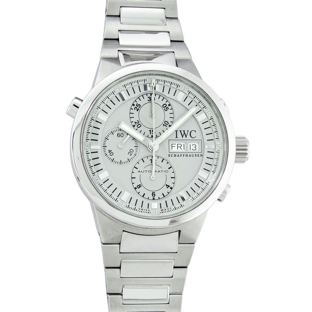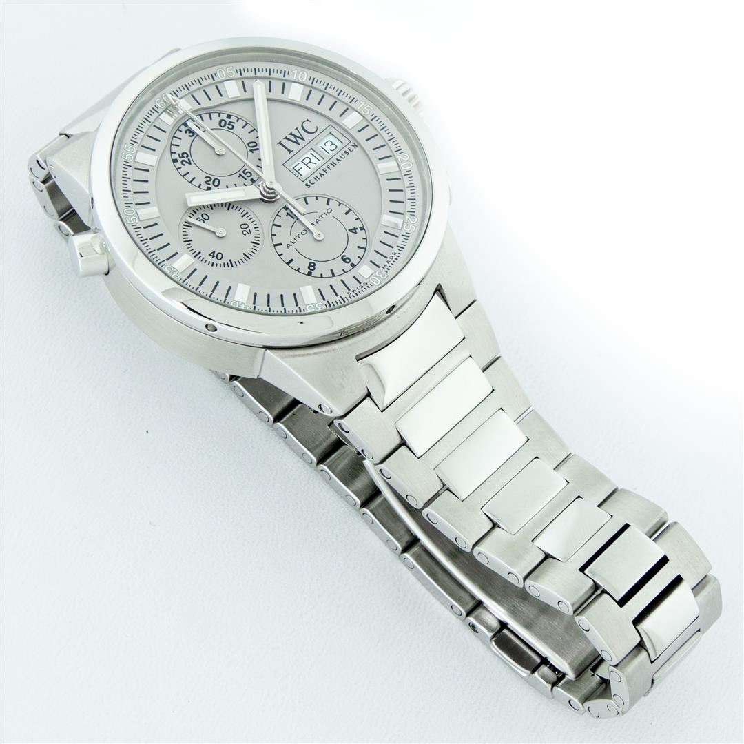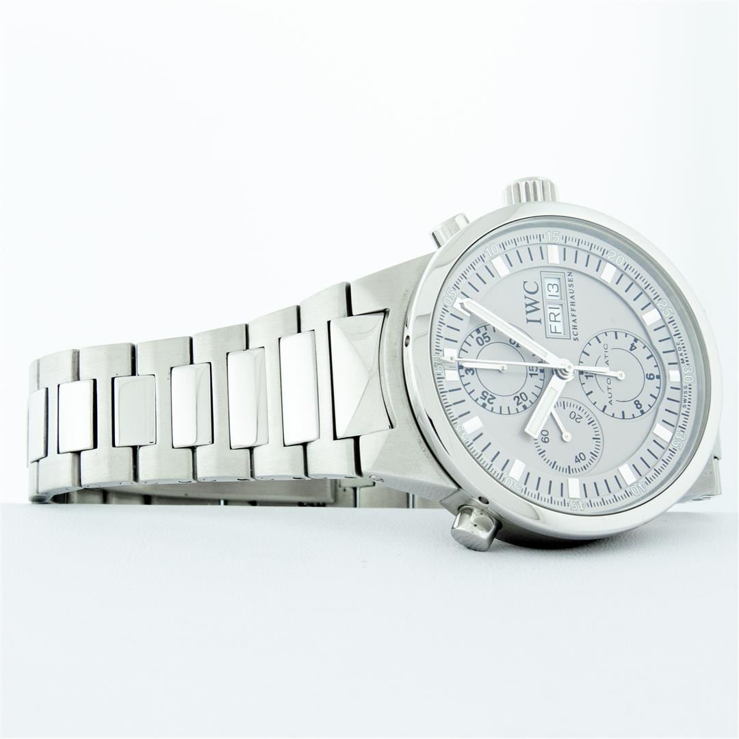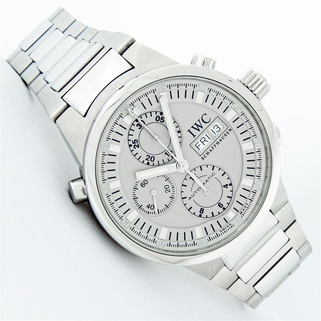 One Mens IWC Stainless Steel GST Rattrapante Split Second Chronograph Polished bright with Satin Finish, This Watch Has Been Serviced & Electronically Tested, Stainless Steel Case: 43mm, Stainless Steel Crown. Bezel: Stainless Steel Smooth Bezel, Crystal: Sapphire Crystal. Hands: IWC Silver Baton Markers, Movement: Handmade Swiss Automatic Movement. 3 Sub Dials: 60 Second, 30 Minute and 12 Hour Dial: IWC Grey Dial, Window: 3 O'Clock Position Date Display, Functions: Chronograph, Rattrapante, Date, Day, Hour, Minute, Small Second. Model : GST Split Second Chronograph Rattrapante. Condition: G-6 Extra Fine. Bracelet: Stainless Steel IWC GST Bracelet, Bright Polish & Satin Finish. 8.0 Inch Length, Adjustable. Stainless Steel IWC Deployant Clasp. This Watch Has Been Serviced Time Tested And Is In Excellent Condition, It Is Free Of All Scratches And Dents (Small Scratch On Original Crystal)