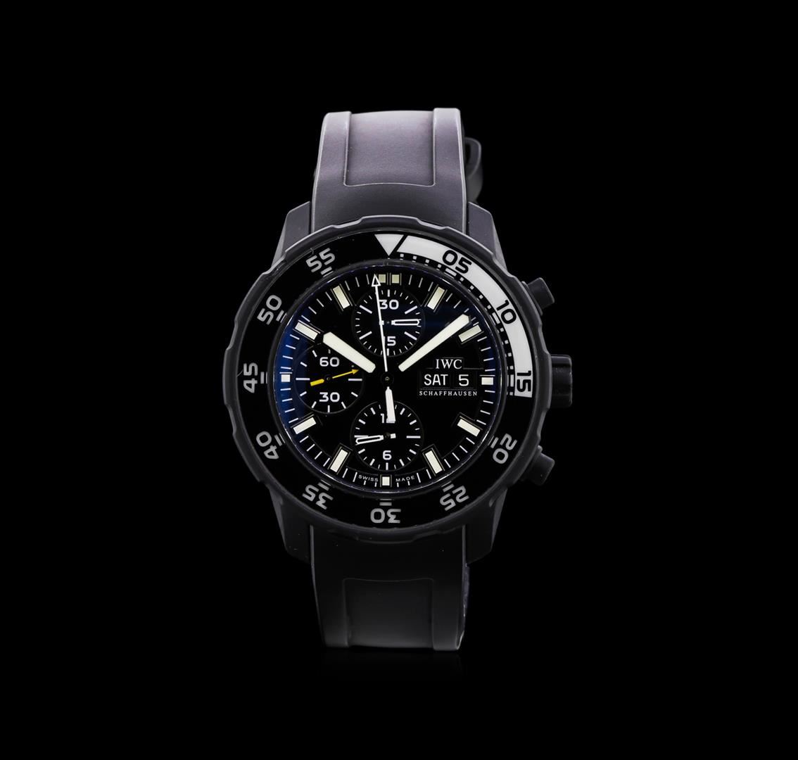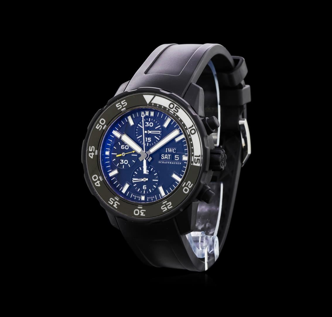 One, IWC Galapagos Aquatimer Chronograph Charles Darwin Foundation Limited Edition wristwatch, Rubber coated Stainless Steel, Case: 44mm, Water Resistant: 120 meters / 400 feet. Case Back: engraved in the rubber frame, TRIBUTE TO CHARLES DARWIN FOUNDATION, GALAPOGOS ISLANDS, additional engraving in the Stainless Steel with the manufacturer's name, model, logo, and ID numbers. IWC Logo'd Crown, Bezel: uni-directional sixty minute timer, with super luminous numerals, Crystal: synthetic sapphire lens, Movement: automatic. Power Reserve: approximately 44 hours. IWC signed Dial: Black, with luminous indices and a ringed minute track, Chronograph Functions: Sub Dials for; continuous seconds, minutes, and hours, Day/Date Window: three o'clock position, IWC Bracelet: Rubber strap, Condition: G-6 Extra Fine. Eight inch length, adjustable. IWC buckle clasp, with logo. Total Weight of Watch 138.61gm. AIG Appraised at $6,800.00.