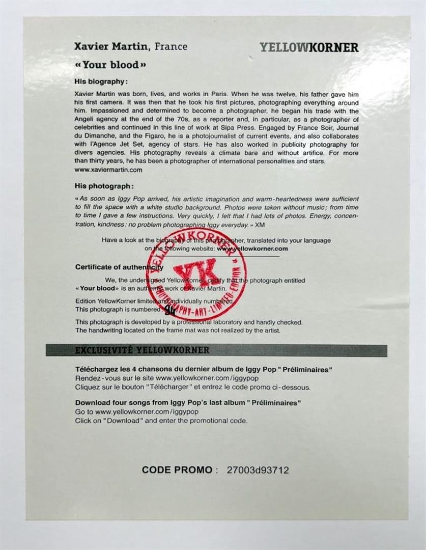 Iggy Pop Xavier Martin "Your Blood" YellowKorner Certified Photograph. Certificate of Authenticity from YellowKorner affixed to the back. Matted Dimensions 16"x20". Protected with Clear Mylar Sleeve.