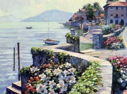 This Italian Lake Como image this is a limited edition, signed and numbered serigraph on paperby Howard Behrens, with COA. 26 x 32