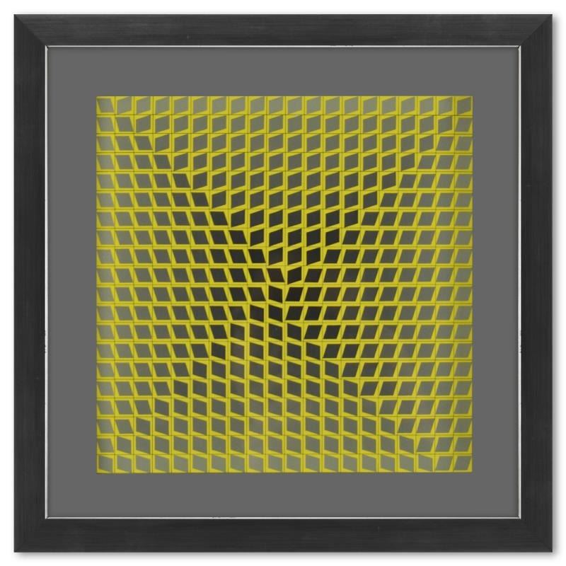 "Illik de la série CTA - 102" is a heliogravure print on paper, published in 1971, by Victor Vasarely (1908-1997). This piece comes custom framed, with a letter of authenticity and with a 1976 Vasarely paperback. Measures approx. 11.5" x 11.5" (frame), 9" x 9" (image).
