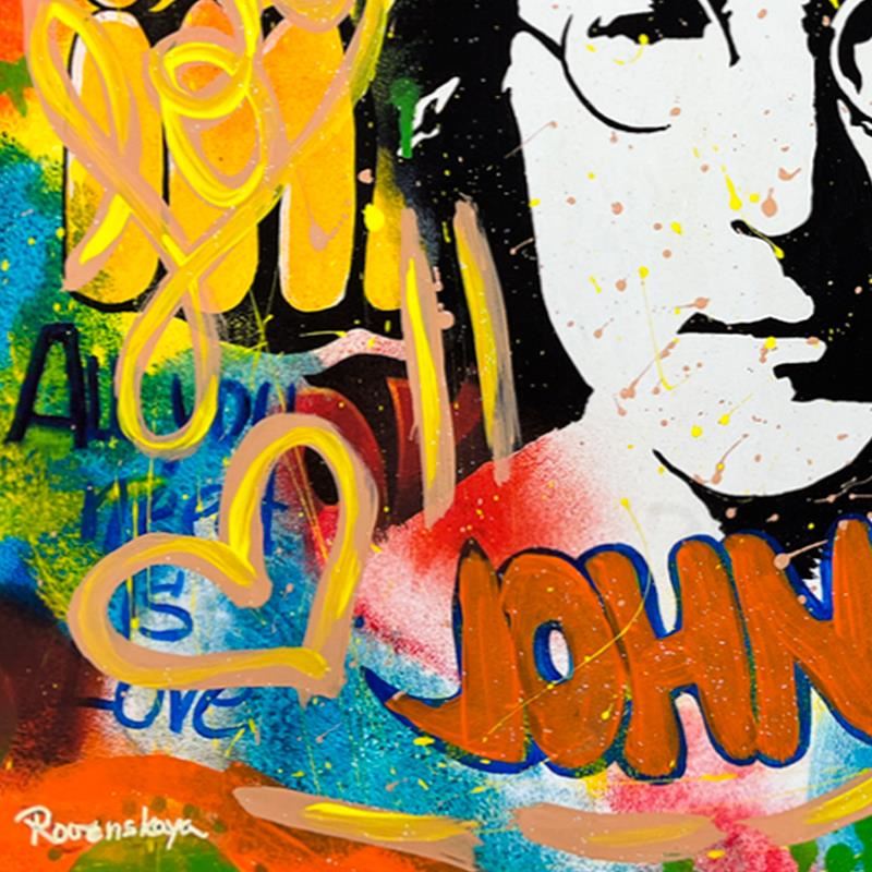 "Imagine All The People" is a one-of-a-kind mixed media on deckle edge paper by Nastya Rovenskaya; hand signed by the artist. This piece comes custom framed and includes letter of authenticity. Measures approximately 36" x 30" (framed), 30" x 24" (image).