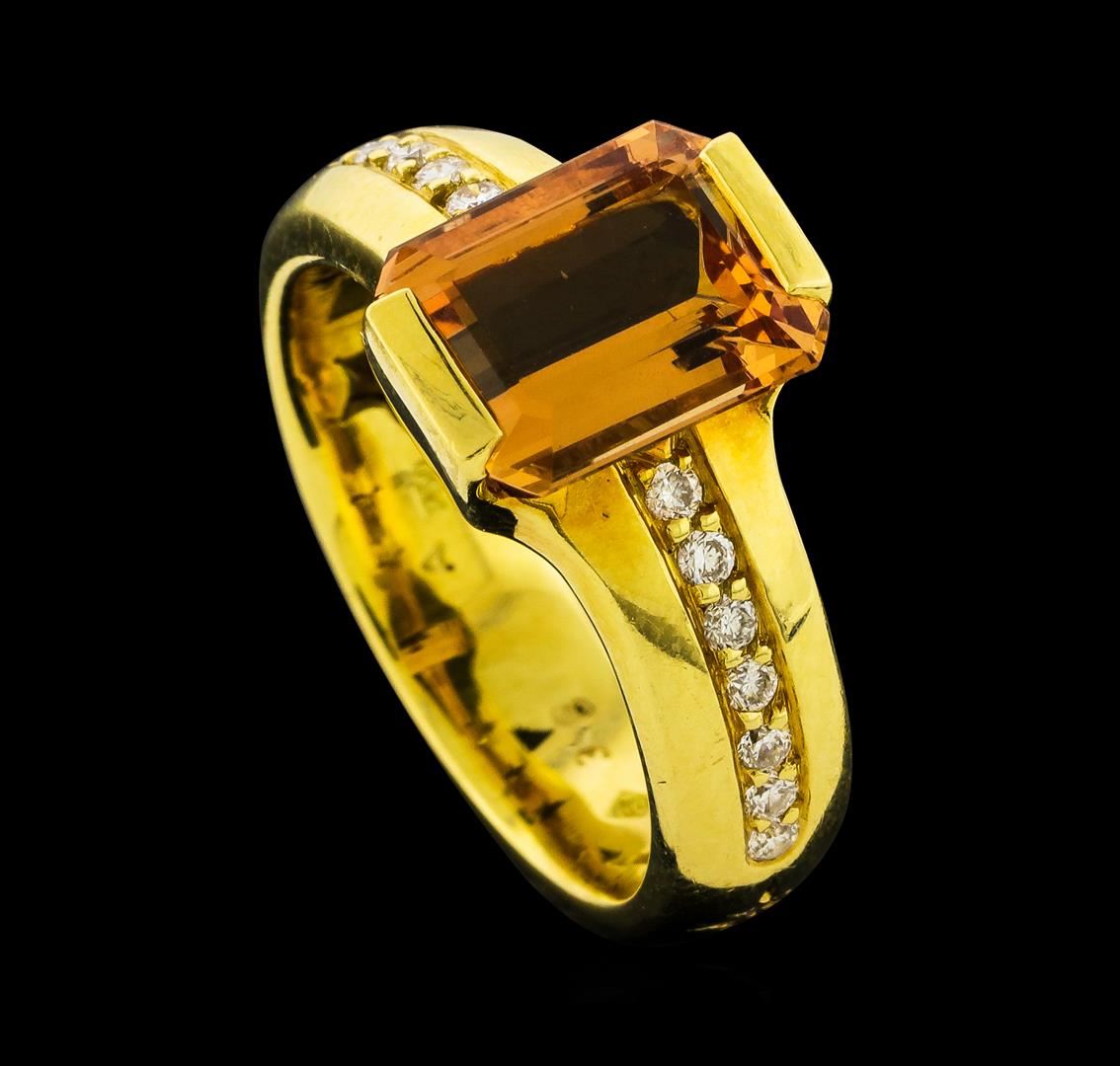 One ring featuring: 18KT Yellow Gold containing Imperial Topaz and Diamonds. Total Weight of Ring: 8.2 grams.
