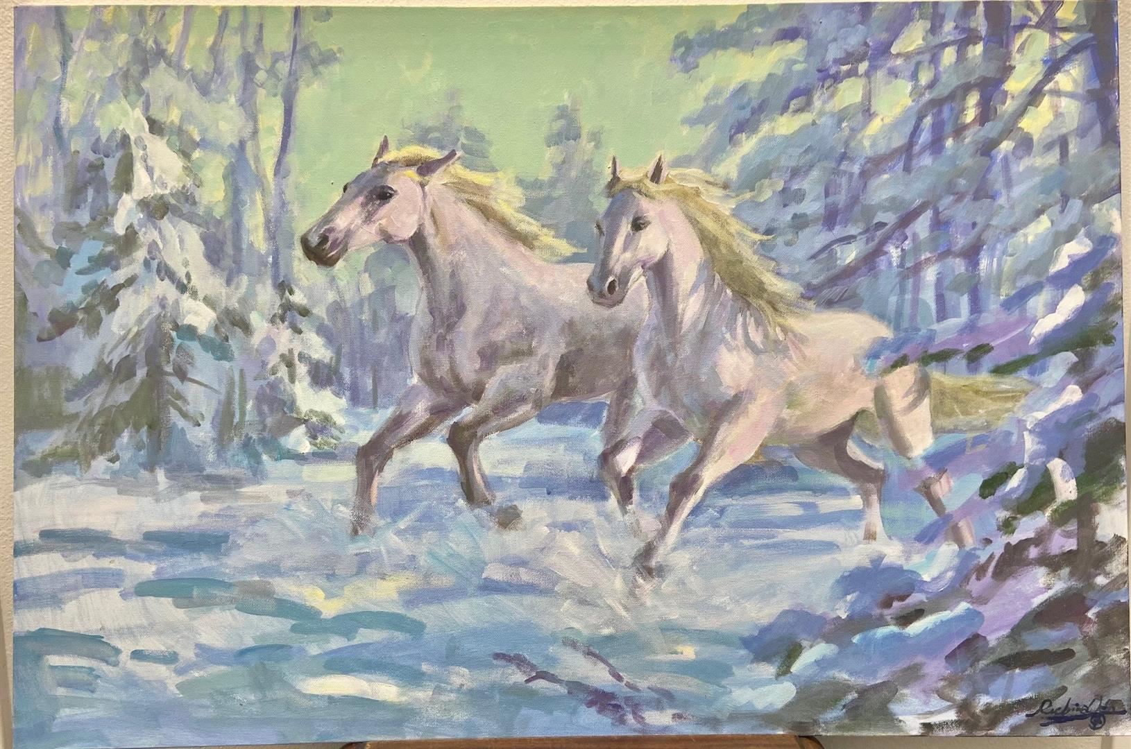 A 36x24" original acrylic on canvas by Richard Ho lets you feel the winter cold setting in around these two white horses.