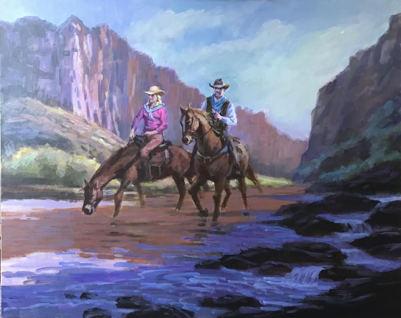 Two riders traverse the giant canyon.An original 24x30" acrylic on stretched canvas by Richard Ho. w/COA.