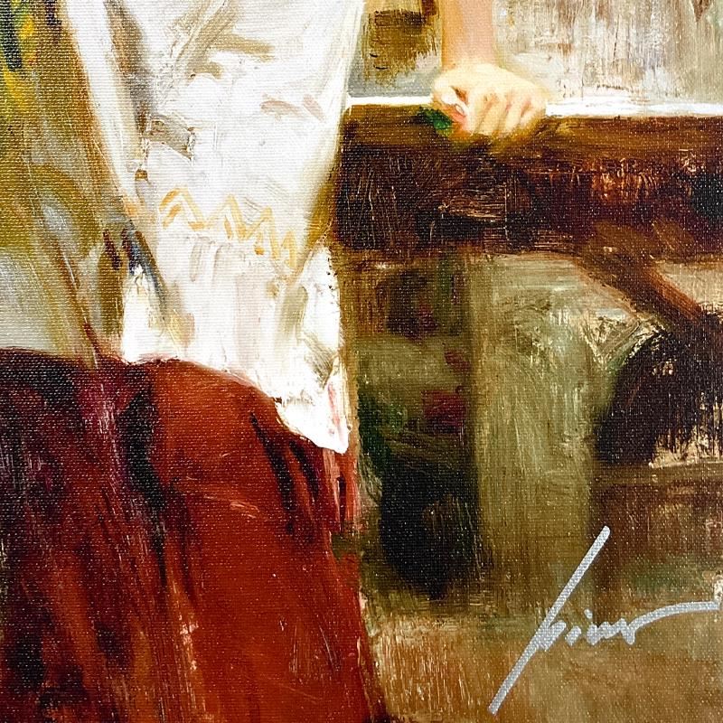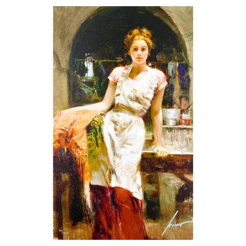 "In the Glow" is a limited edition giclee on canvas by Pino (1939-2010), numbered 70/500 and hand signed by the artist. Includes Certificate of Authenticity. Measures approx. 20" x 12" (image).