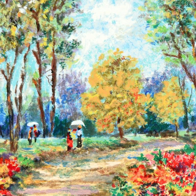 In the Park by Polak (1922-2008). "In the Park" is a limited edition serigraph on paper, numbered and hand signed by Dimitri Polak (1922-2008). Includes Certificate of Authenticity. Measures approx. 16.5" x 13.5" (border), 15" x 12" (image).