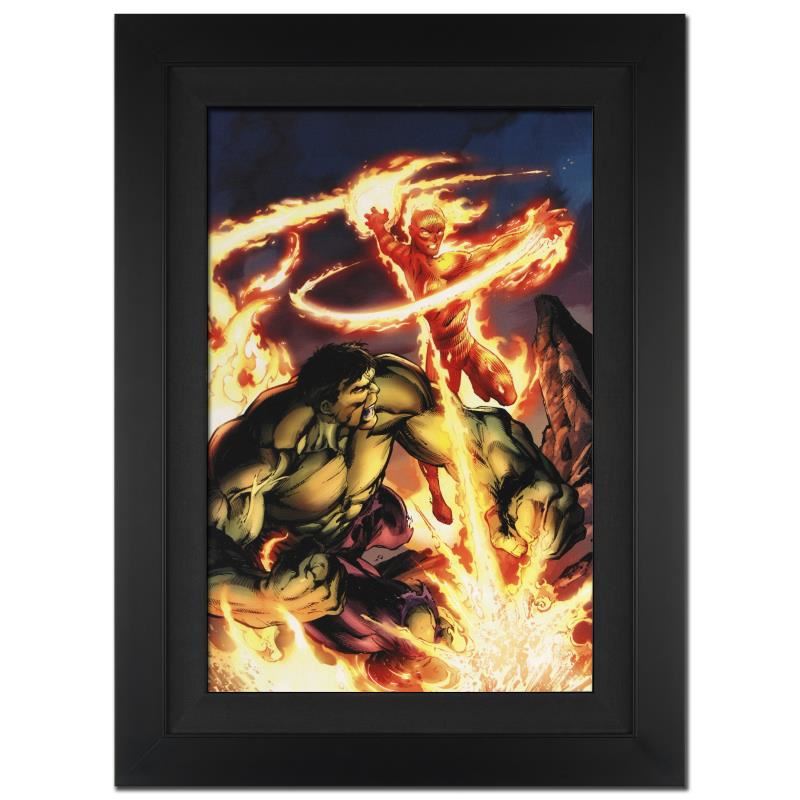 A piece of comic book history, this limited edition, from original art by Mark Bagley, depicts a fiery battle between The Human Torch and the Incredible Hulk. Mark Bagley got his start by winning Marvel's Try-Out contest, for which he was awarded penciling jobs. Soon, Bagley was drawing regularly for the renowned Spider-Man franchise. "Incredible Hulk & The Human Torch: From the Marvel Vault #1" is an extremely limited edition giclee on canvas by Mark Bagley presented by Marvel Comics, hand signed by the great Stan Lee and numbered out of only 10! This piece comes custom framed and ready to hang. Includes Certificate of Authenticity! Measures approx. 25" x 34" (with frame), 18" x 27" (image).