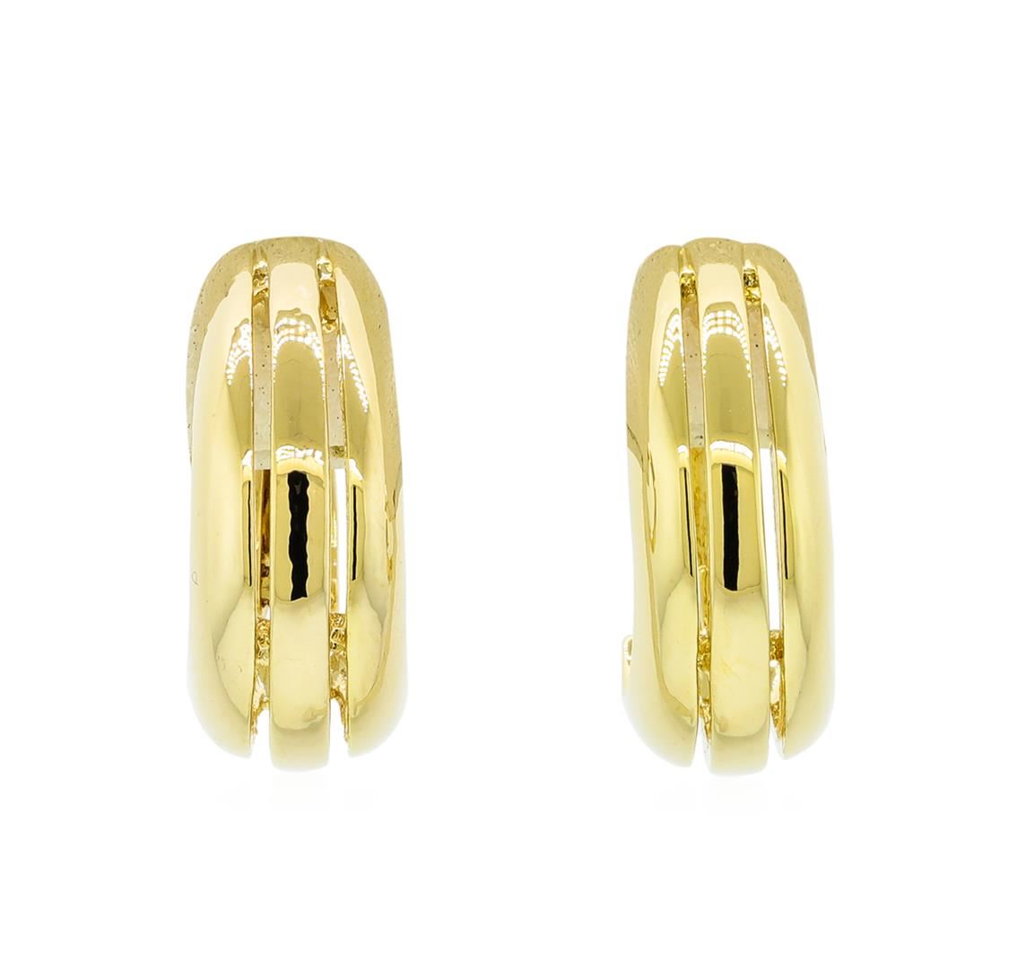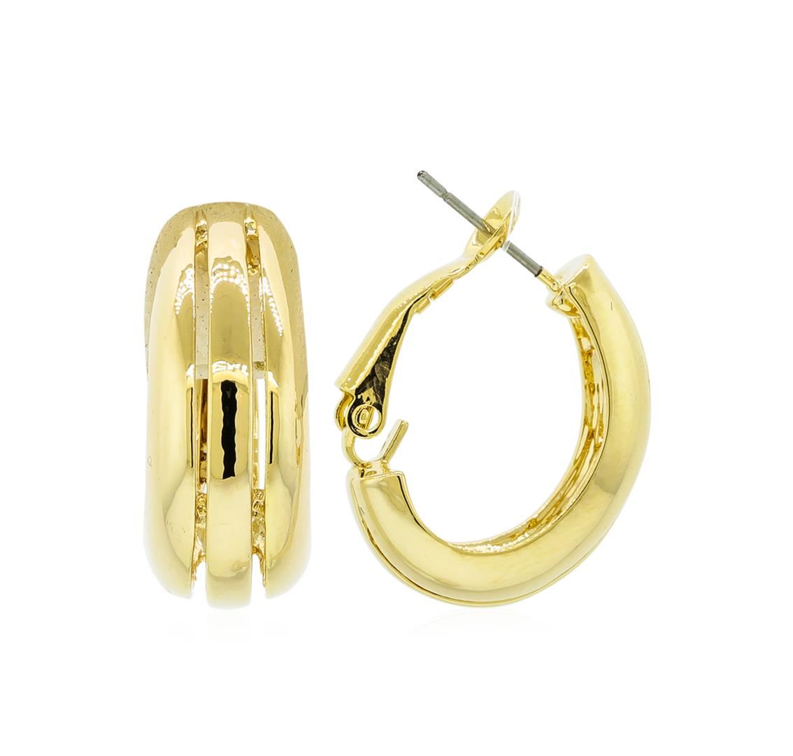 High end designer jewelry. Indent Design Hoop Earrings - Gold Plated. Gold Plated Lever Clasp. Gold. 1inch.