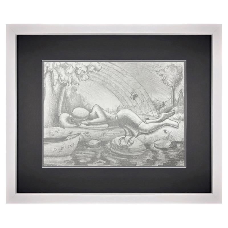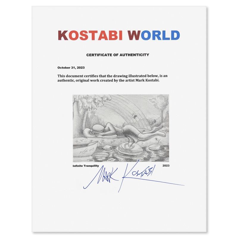 "Infinited Tranquility" is an original drawing on paper by Mark Kostabi, hand signed by the artist. This piece comes custom framed and includes a certificate of authenticity. Measures approximately 14" x 17.5" (frame), 8" x 11.5" (image). This item requires special handling and may have a longer than usual turnaround.