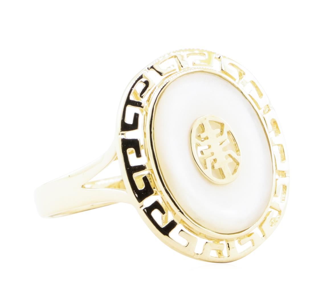 One ring featuring: 14KT yellow gold weighing 4.6 grams containing one inlaid oval piece of mother of pearl measuring 16mm by 12mm.