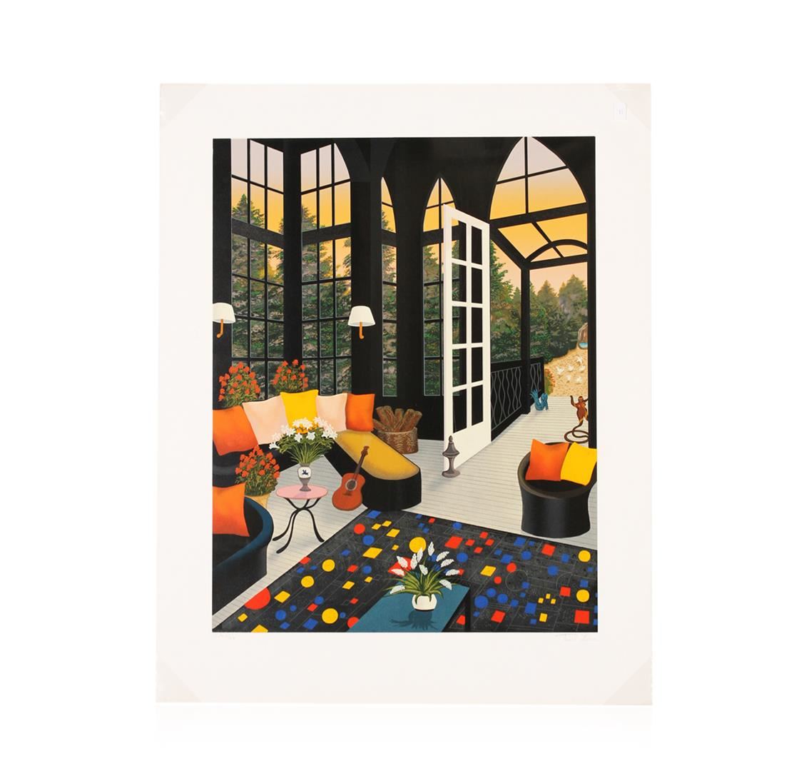 One of Fanch's best selling images; Interior with Guitar was painted in the most vibrant tones, at the artist's Sausalito home, and produced as a serigraph on paper by Blinder Fine Arts. This signed & numbered limited edition - designated EA 3/22 -- is from his European Edition. It comes with a hand signed book "The Art of Fanch Ledan", (a $ 50 value), in which this image is prominently featured. Book & print shipped separately.