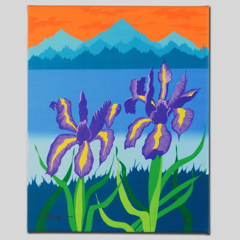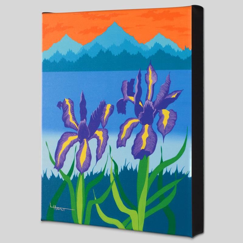 Larissa Holt, a student of distinguished artist Eyvind Earle(1916-2000), uses bold colors and breathtaking scenery to create images of Nature in her own unique style. "Iris Lake" is a limited edition giclee on stretched canvas by Holt, numbered and bearing Holt's authorized signature. This piece comes gallery wrapped with a black border, and is ready to hang. Includes Certificate of Authenticity! Measures approx. 10" x 12.5" x 1.5" (image).