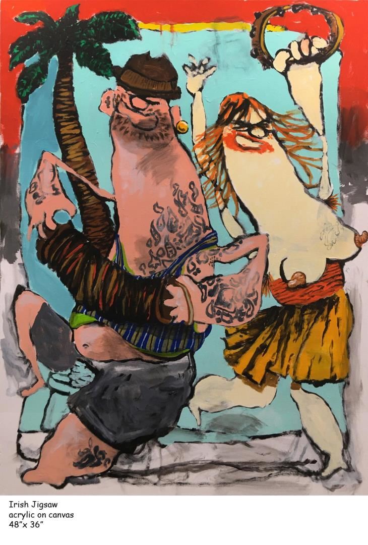 A couple of Stephen Holland's whimsical Longneck characters dance to an Irish Jig in this 48x36" original acrylic on canvas; w/COA.
