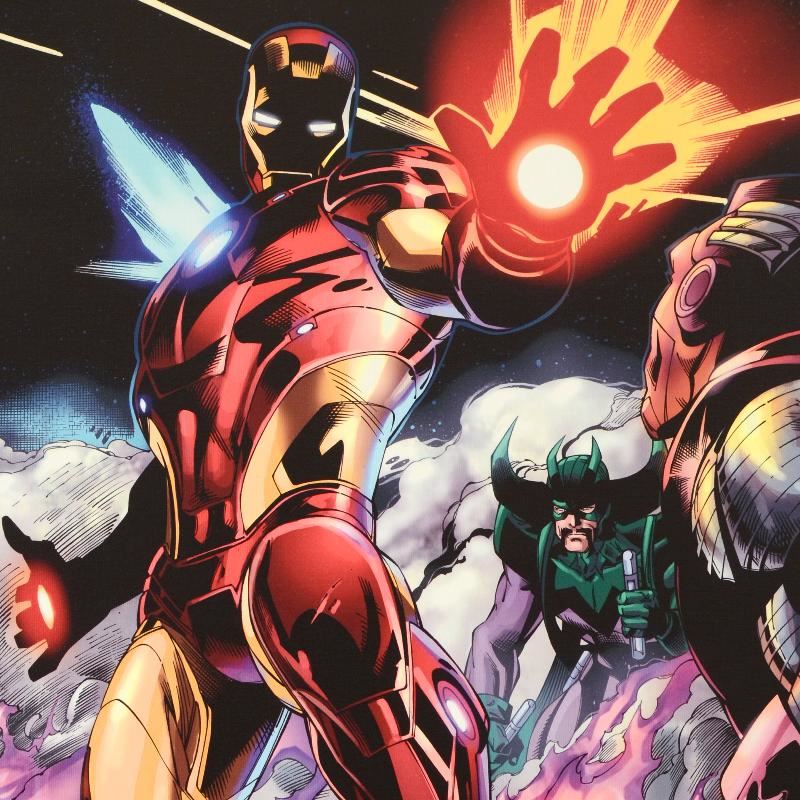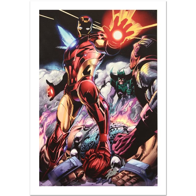 A piece of comic book history, this limited edition, from original art by Scot Eaton, depicts an action packed scene starring Iron Man. Born and raised in Vermont, Scot Eaton's artistic talent became apparent in elementary school when he created detailed drawings of dinosaurs and comic characters like Spider-Man. After high school graduation, he went on to college. In the early 1990s he started penciling for DC comics from his apartment. He went on to draw Silver Surfer and Thor for Marvel. "Iron Man/Thor #2" is a limited edition giclee on canvas by Scot Eaton presented by Marvel Comics, numbered and hand signed by the great Stan Lee! Includes Certificate of Authenticity! Measures approx. 18" x 27" (image).