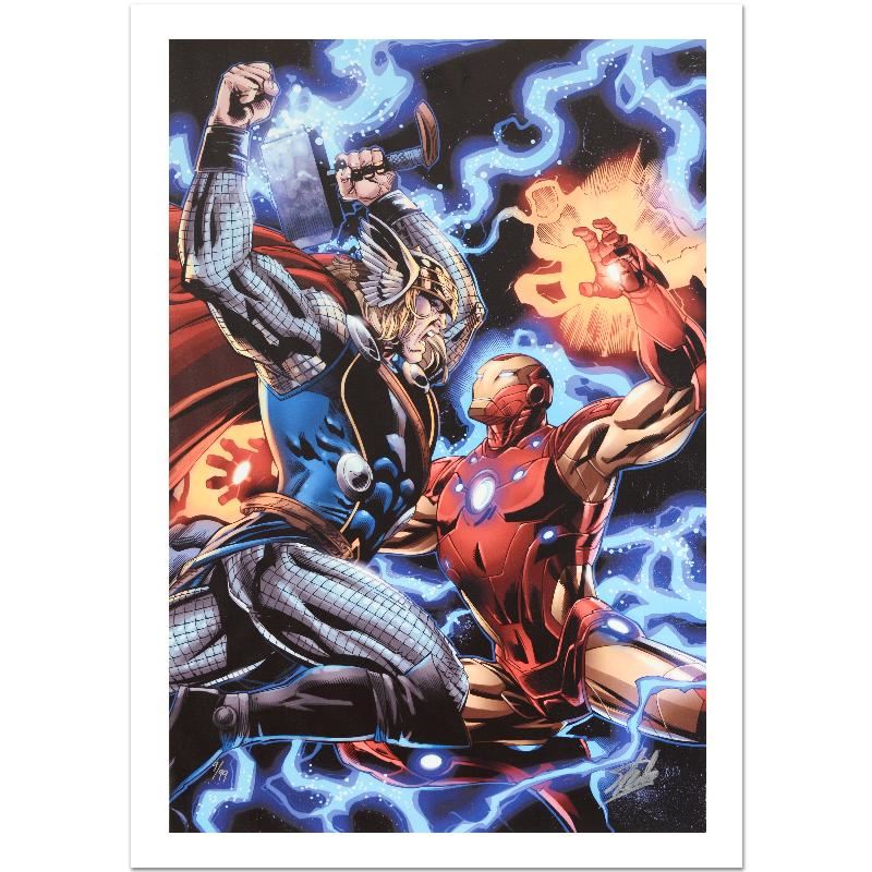 A piece of comic book history, this limited edition, from original art by Scot Eaton, depicts an action packed scene starring Iron Man and Thor. Born and raised in Vermont, Scot Eaton's artistic talent became apparent in elementary school when he created detailed drawings of dinosaurs and comic characters like Spider-Man. After high school and college, Eaton started penciling for DC comics from his apartment in the early 1990's. He went on to draw Silver Surfer and Thor for Marvel. "Iron Man/Thor #3" is a limited edition giclee on canvas by Scot Eaton presented by Marvel Comics, numbered and hand signed by the great Stan Lee! Includes Certificate of Authenticity! Measures approx. 18" x 27" (image).