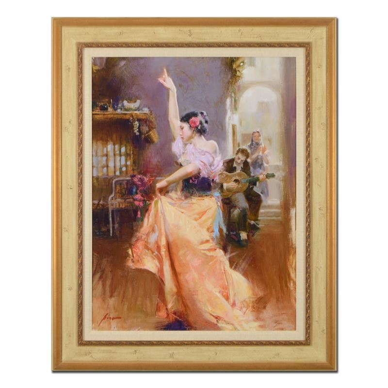 Pino's portraits allow glimpses into intensely personal, intimate spaces, conveying emotion through rich, warm color and sensual brushwork. "Isabella" is a hand embellished limited edition giclee on canvas by Pino (1939-2010). The piece is numbered, hand signed, custom framed, and includes certificate of authenticity. Measures approx. 41.5" x 52" (frame), 30" x 40" (image). This item requires special handling and may have a longer than usual turnaround.