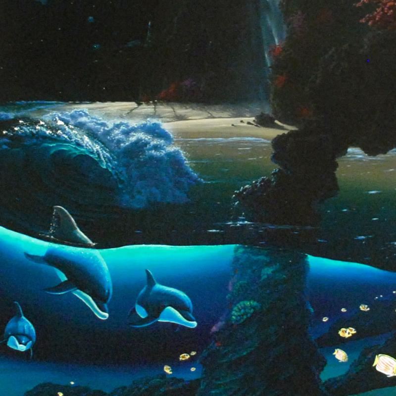 Wyland's true love for nature is so clearly conveyed in each of his brilliantly detailed works. "Island Paradise" is a limited edition giclee on canvas, numbered and hand signed by Wyland! Includes Certificate of Authenticity! Measures approx. 20" x 40" (image).