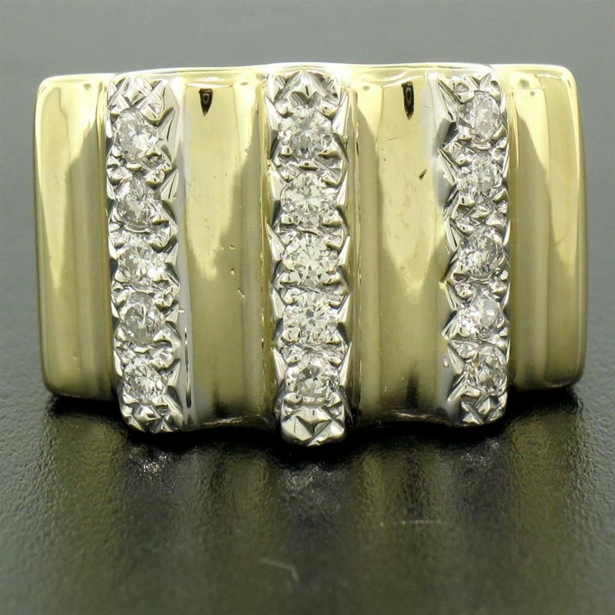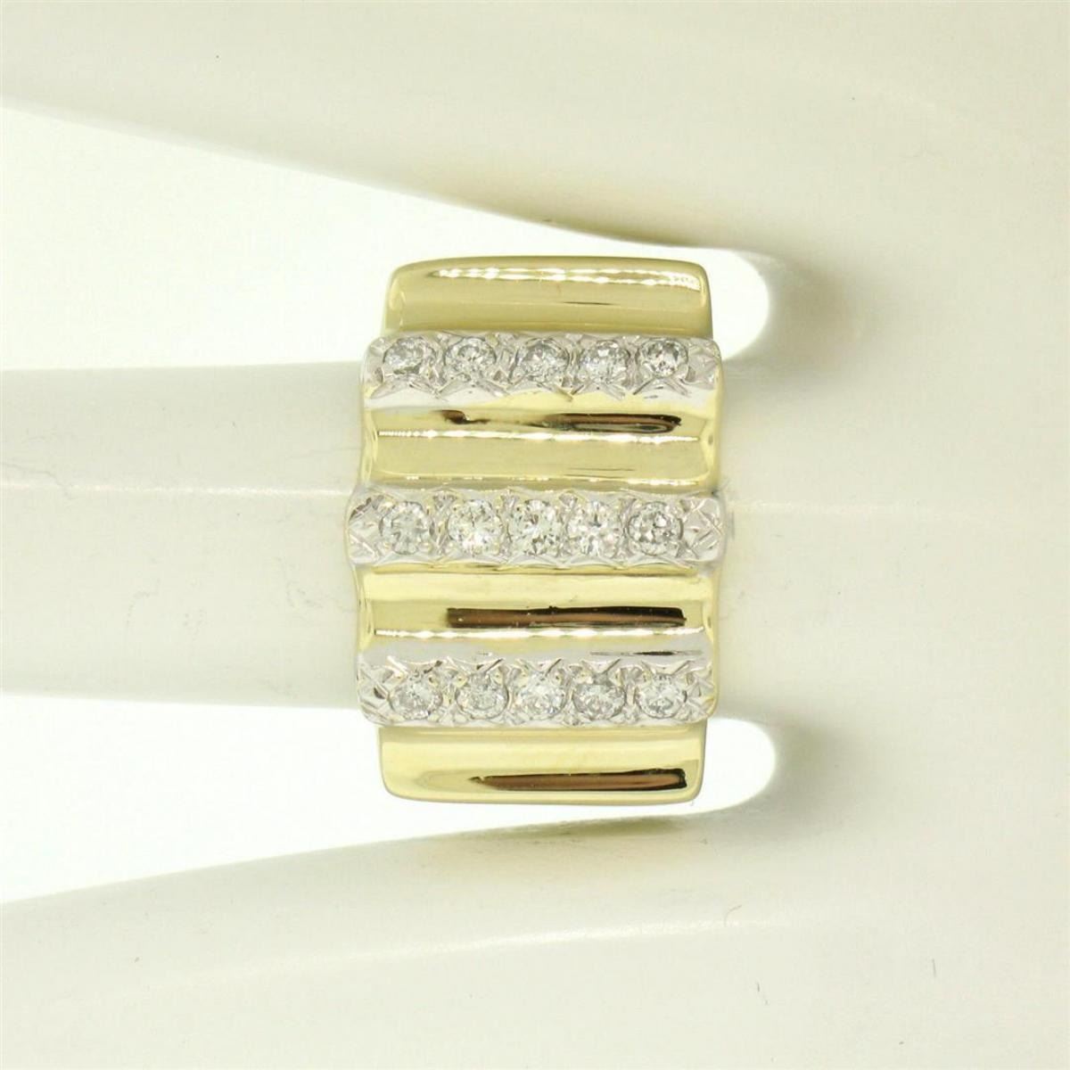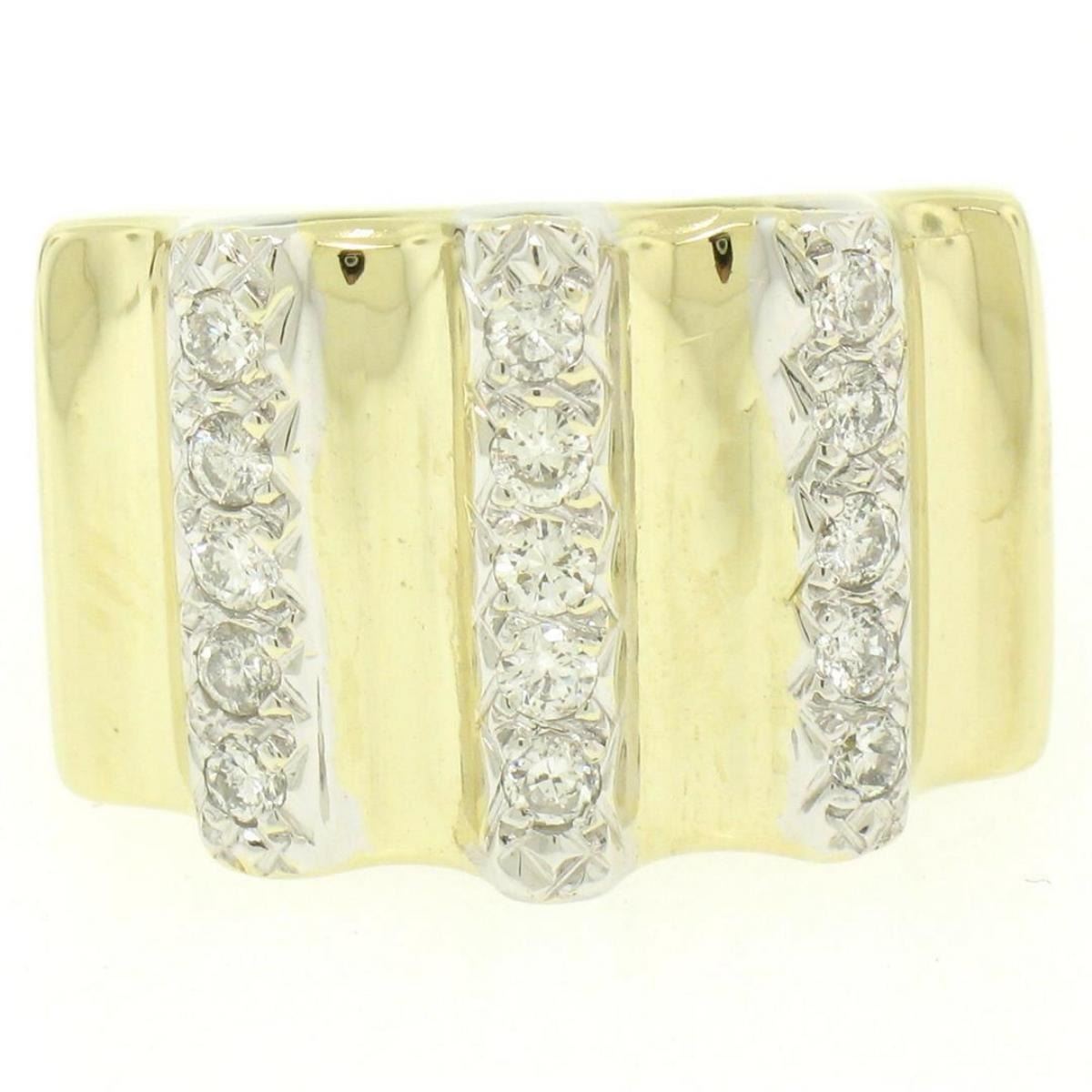 One Solid 14k Solid Yellow Gold Wide band ring with vertical grooved desgin. Measures 14.15mm wide and 3.6mm rise off the finger. 15 round diamonds total approx. 0.35ctw with VS1 clarity and G/H color. Weight is 9.20 grams.