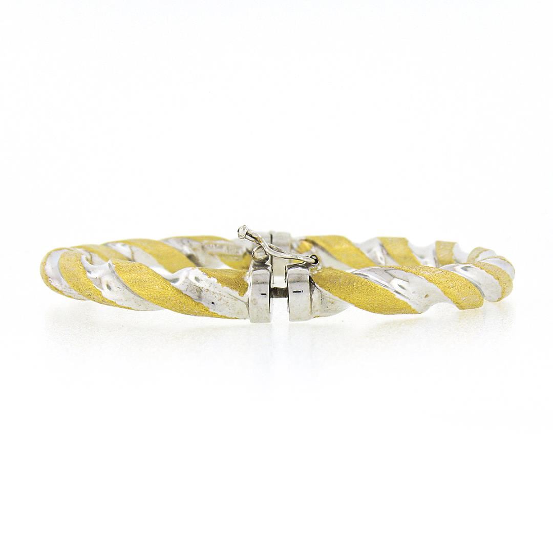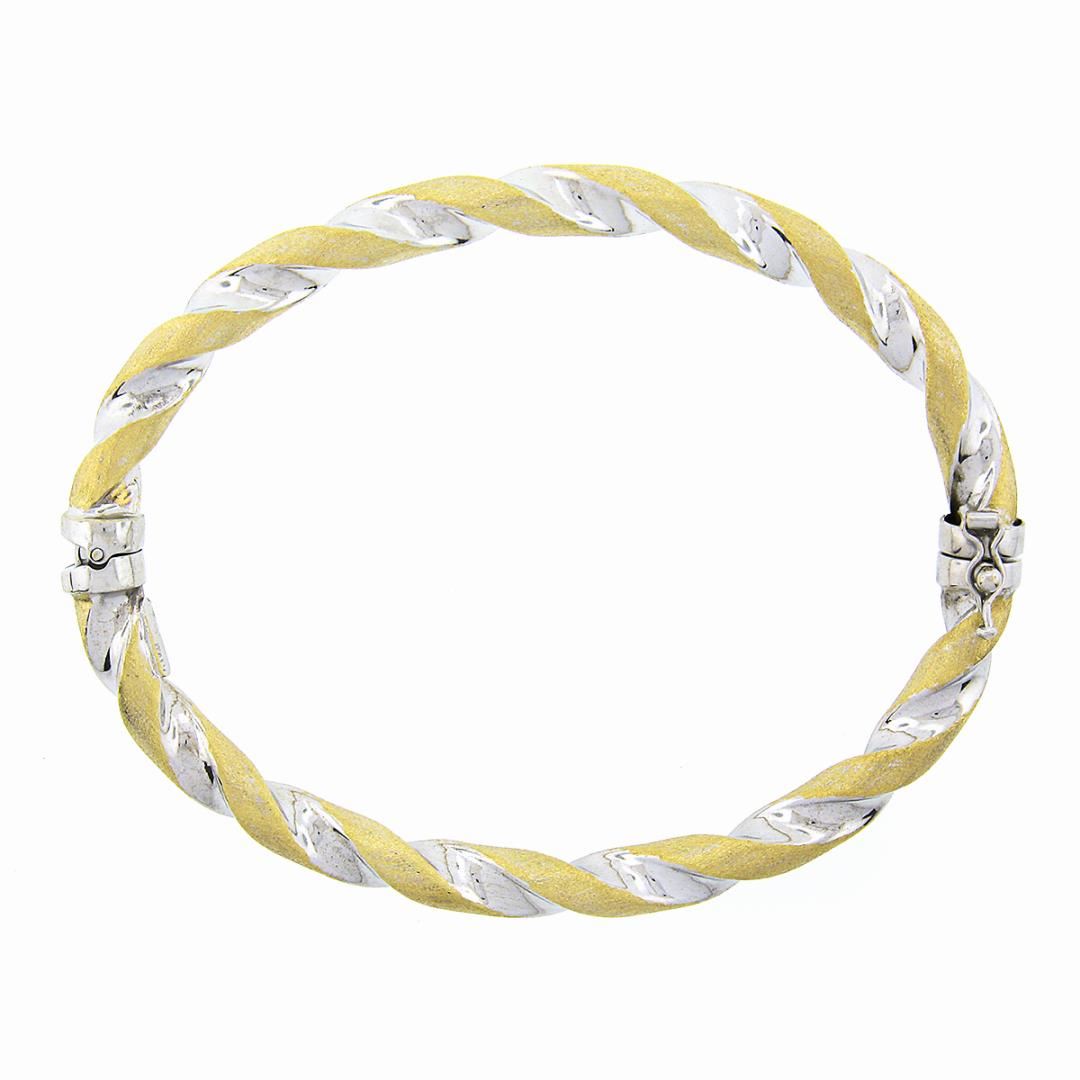 A solid 14k white & yellow gold twisted bangle bracelet. It weighs a total of 11.14 grams, measures 6mm wide, and measures 7 inches in length.