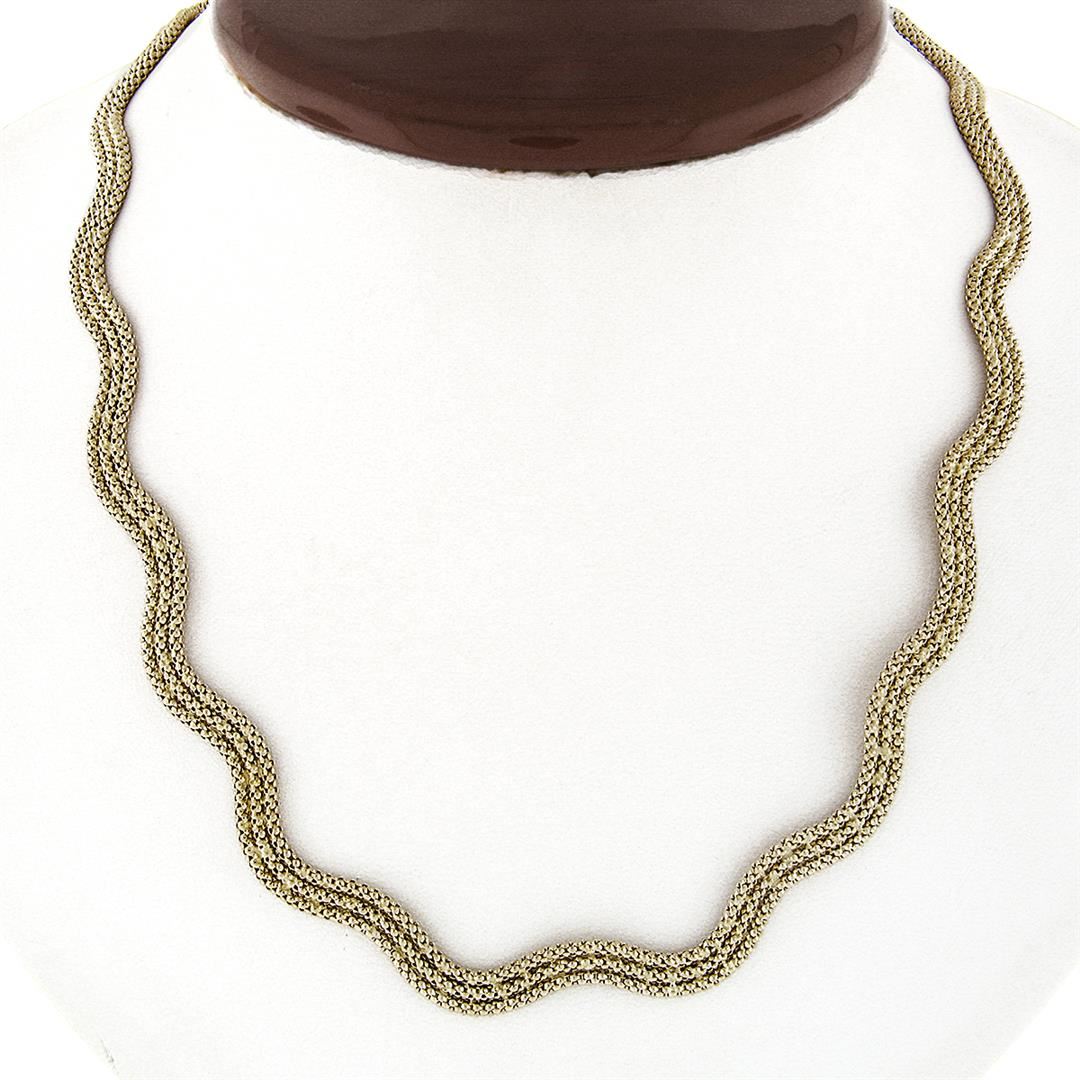 A solid 14k yellow gold 3 row wavy chain link necklace. 17.5 inch popcron link chain, 20.20 grams total weight.