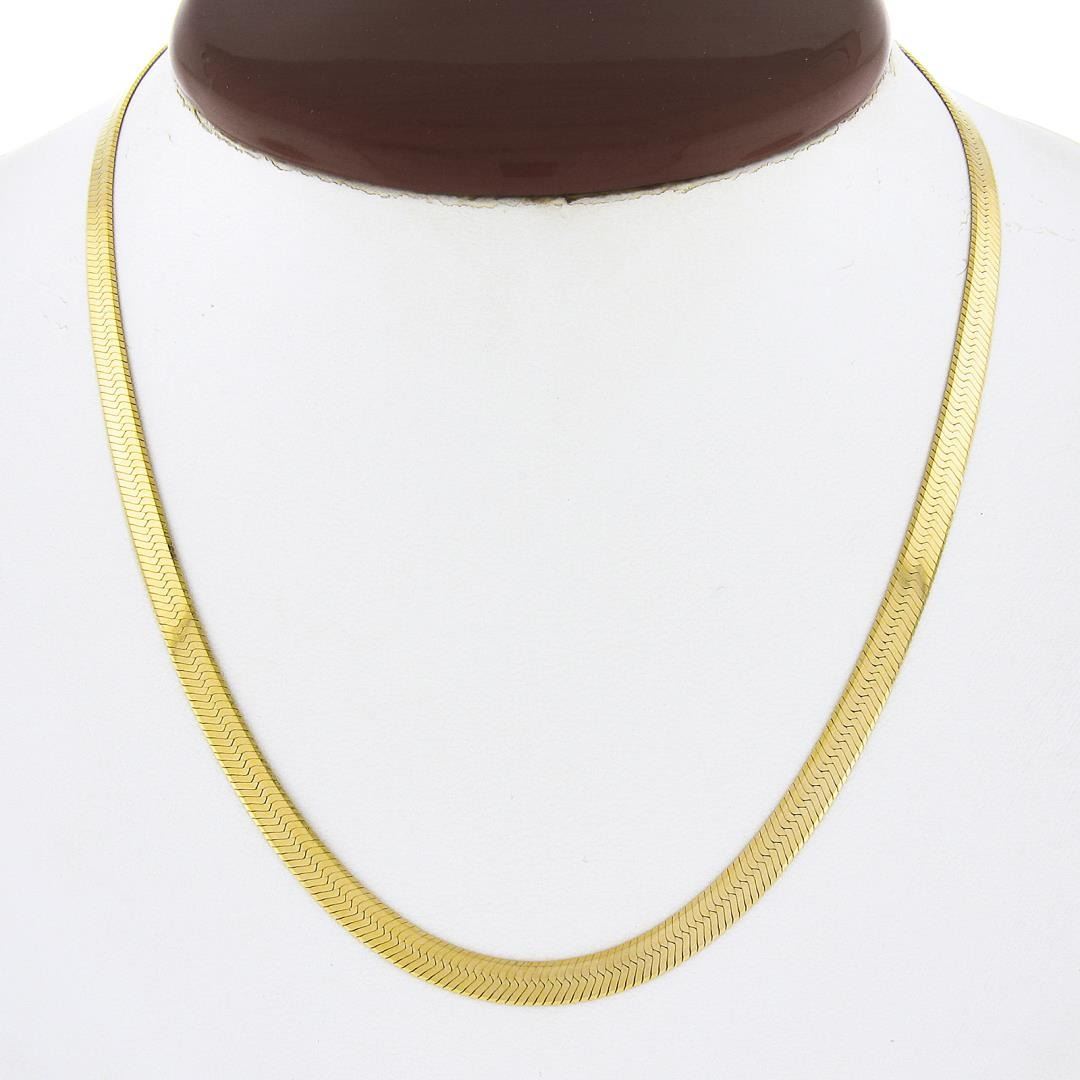 A solid 14k yellow gold herringbone link necklace. It weighs a total of 11.75 grams, measures 4.65mm wide, and measures 16 inches in length.