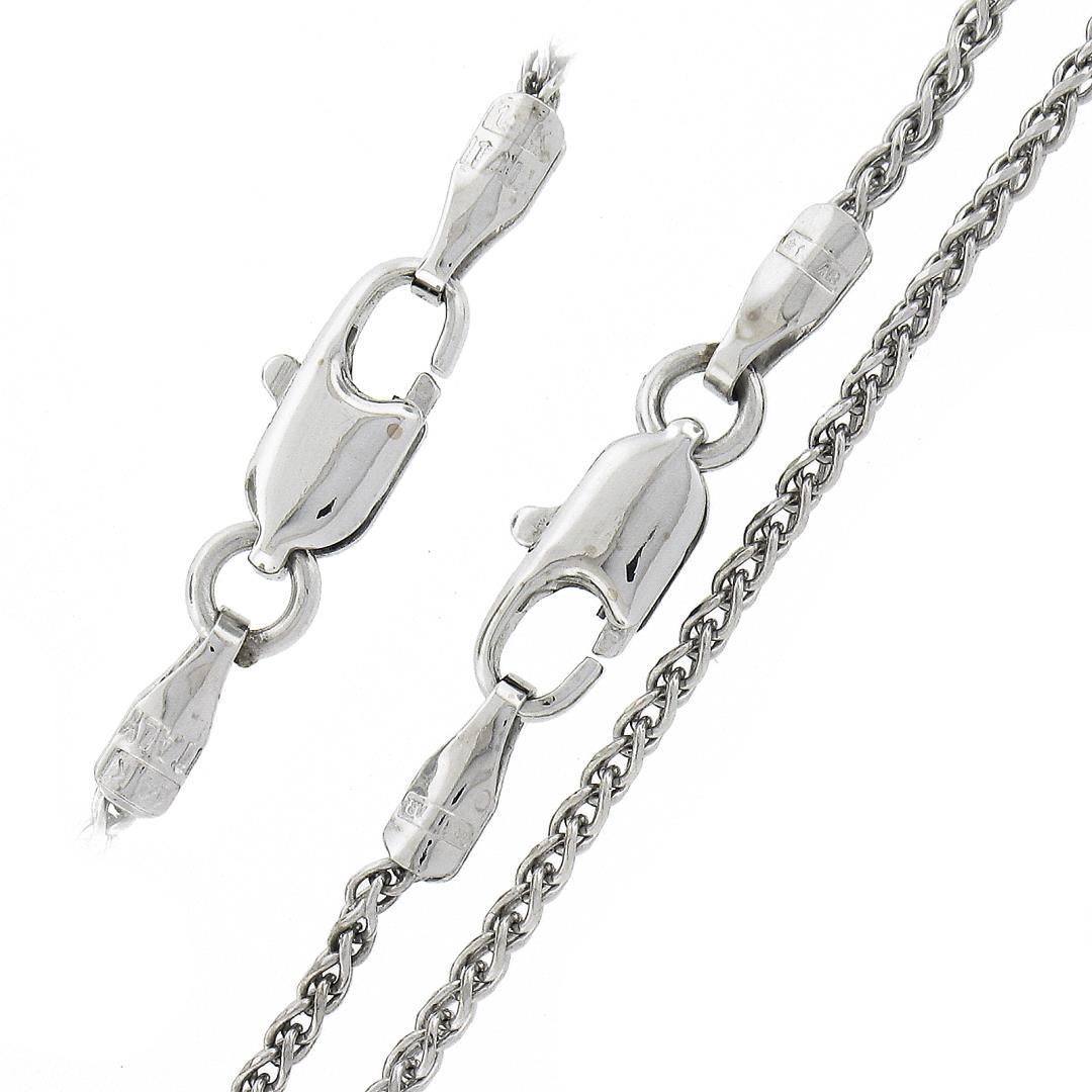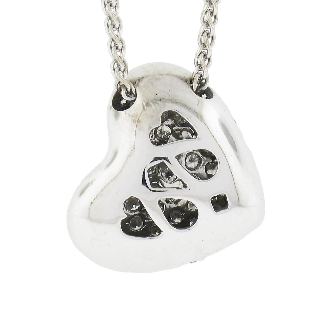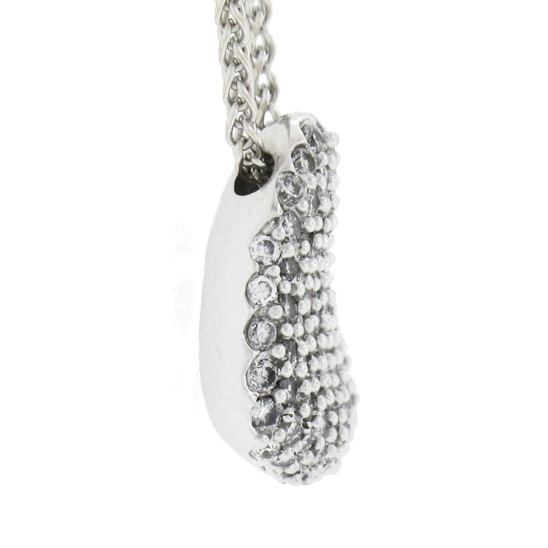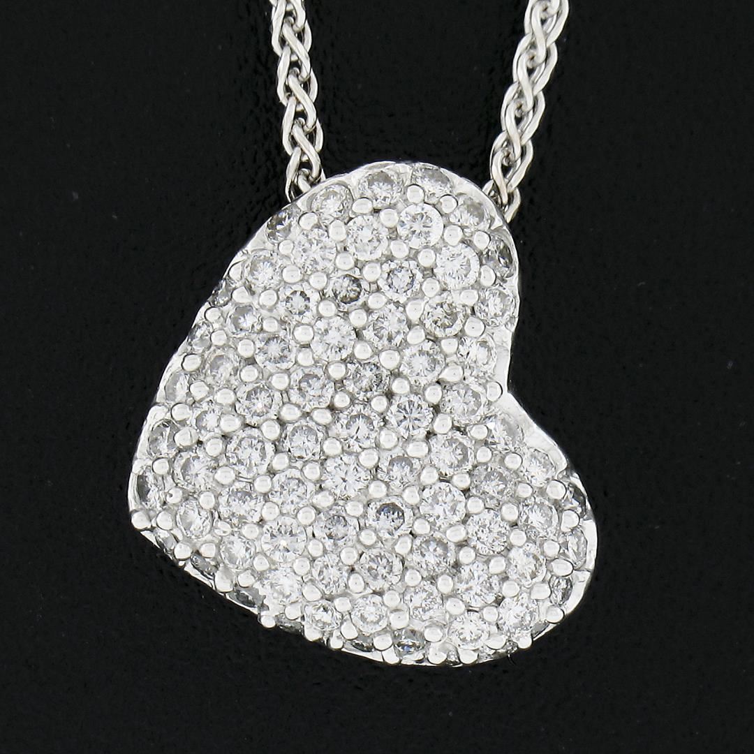 A solid 14k white gold heart pendant necklace, covered with numerous of round cut natural diamonds (G/H - SI1-I2 ; 1.0ctw). The pendant weighs a total of 4.75 grams, measures 14.5x12.6mm including the bail, and 16 inch wheat link chain.