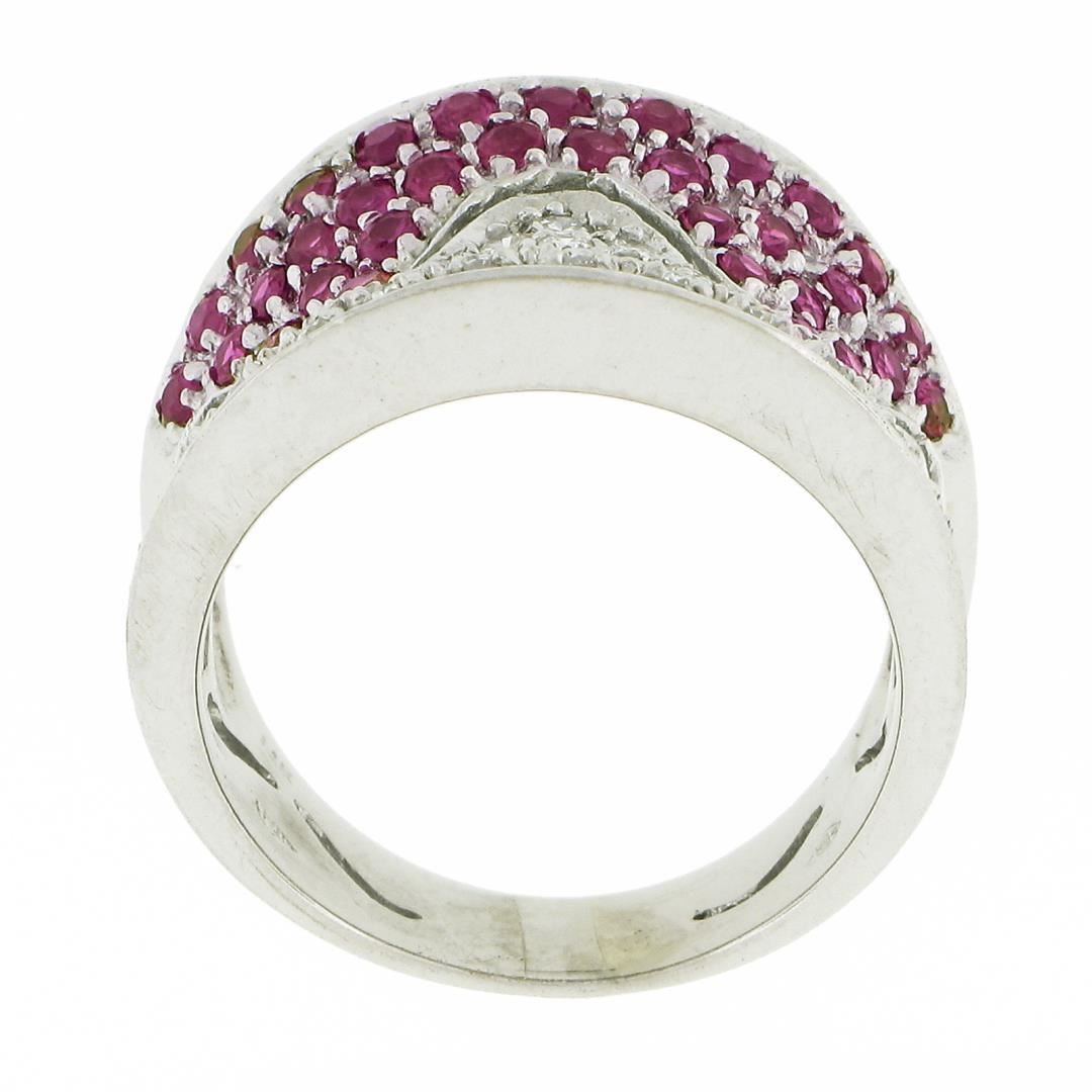 A solid 14k white gold wide band ring, with 39 round cut natural diamonds (G/H - SI1; 0.73ctw), and 34 round cut natural pink sapphires (1.10ctw). The ring is size 7.5, weighs a total of 9.23 grams, and measures 15.1mm wide.