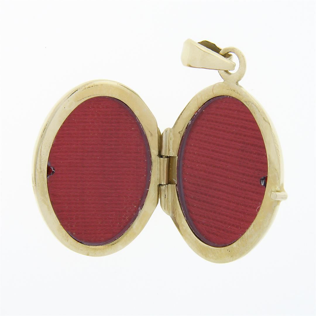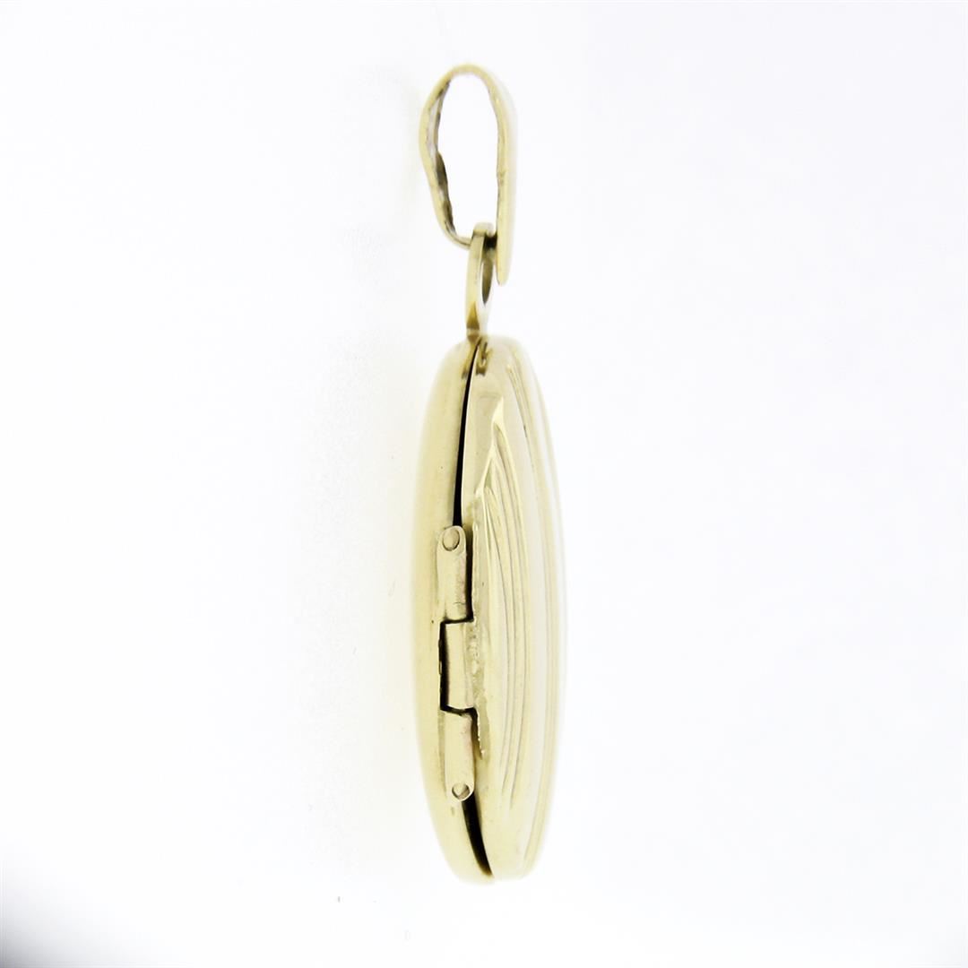 A solid 14k yellow gold italian oval locket pendant. The pendant weighs a total of 7.05 grams, measures 37.85x21.20mm including the bail, and the inside of the bail measures 7.50x3.15mm.