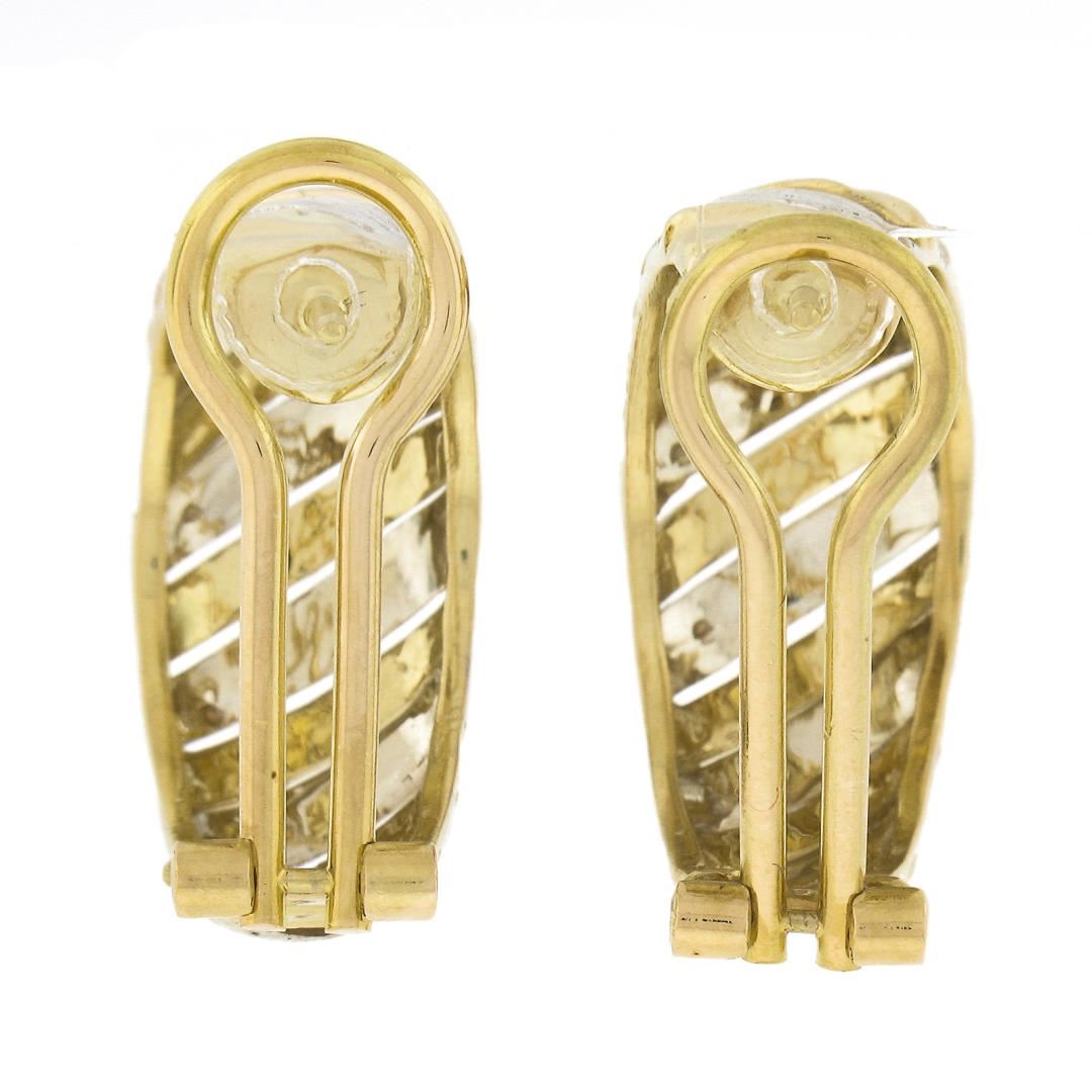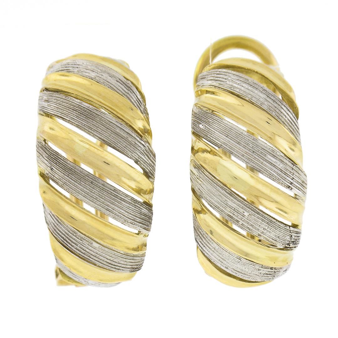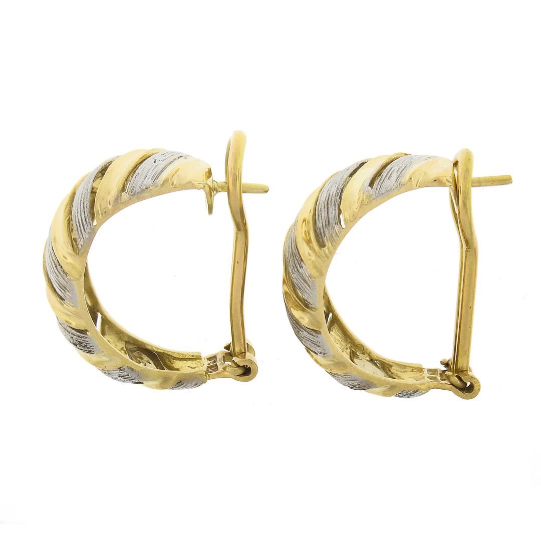 A solid 18k yellow & white gold cuff earrings. The earrings measure approximately 22.8x11.2mm and weigh a total of 10.30 grams.