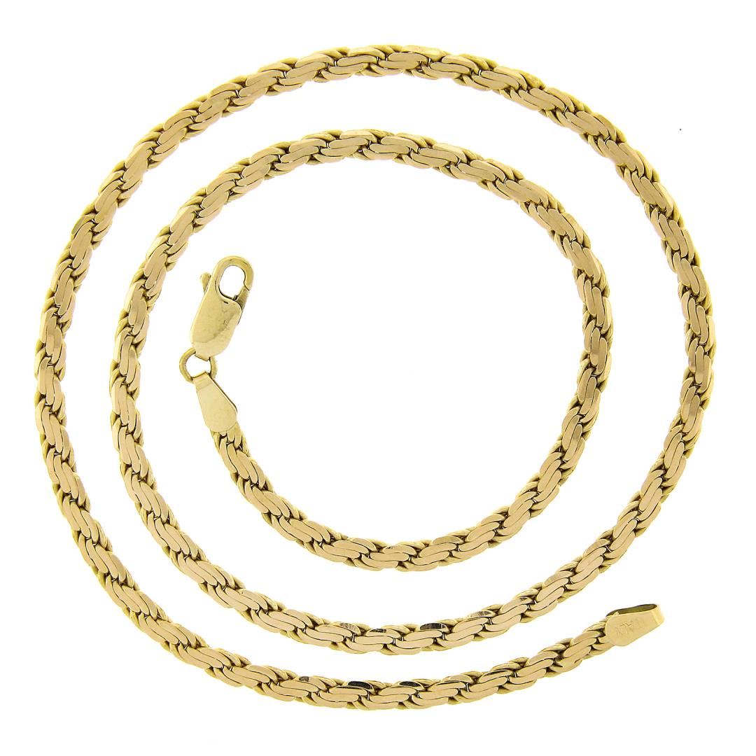 A solid 14k yellow gold italian rope link chain. It weighs a total of 16.84 grams, measures 3.2mm wide, and measures 17 inches in length.