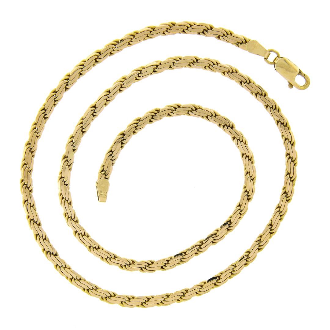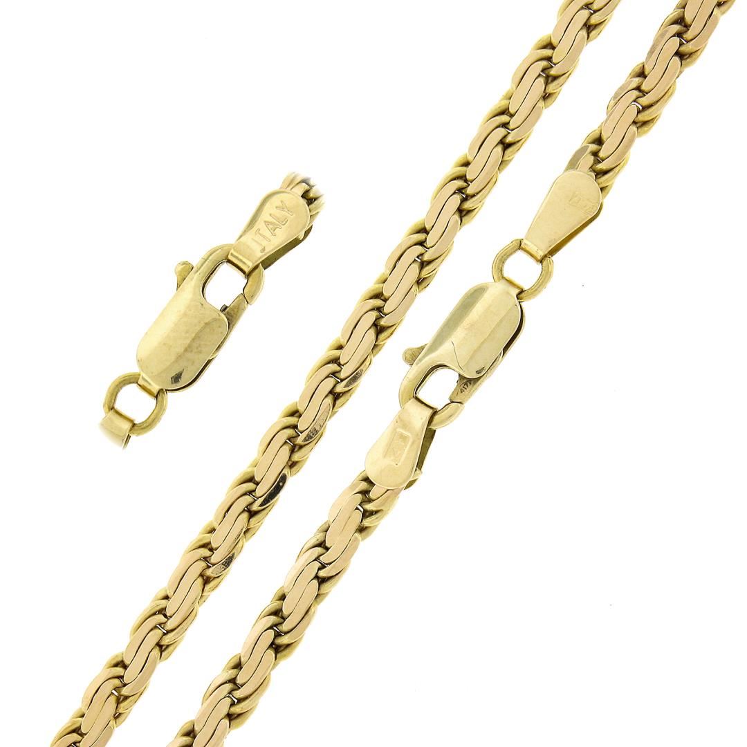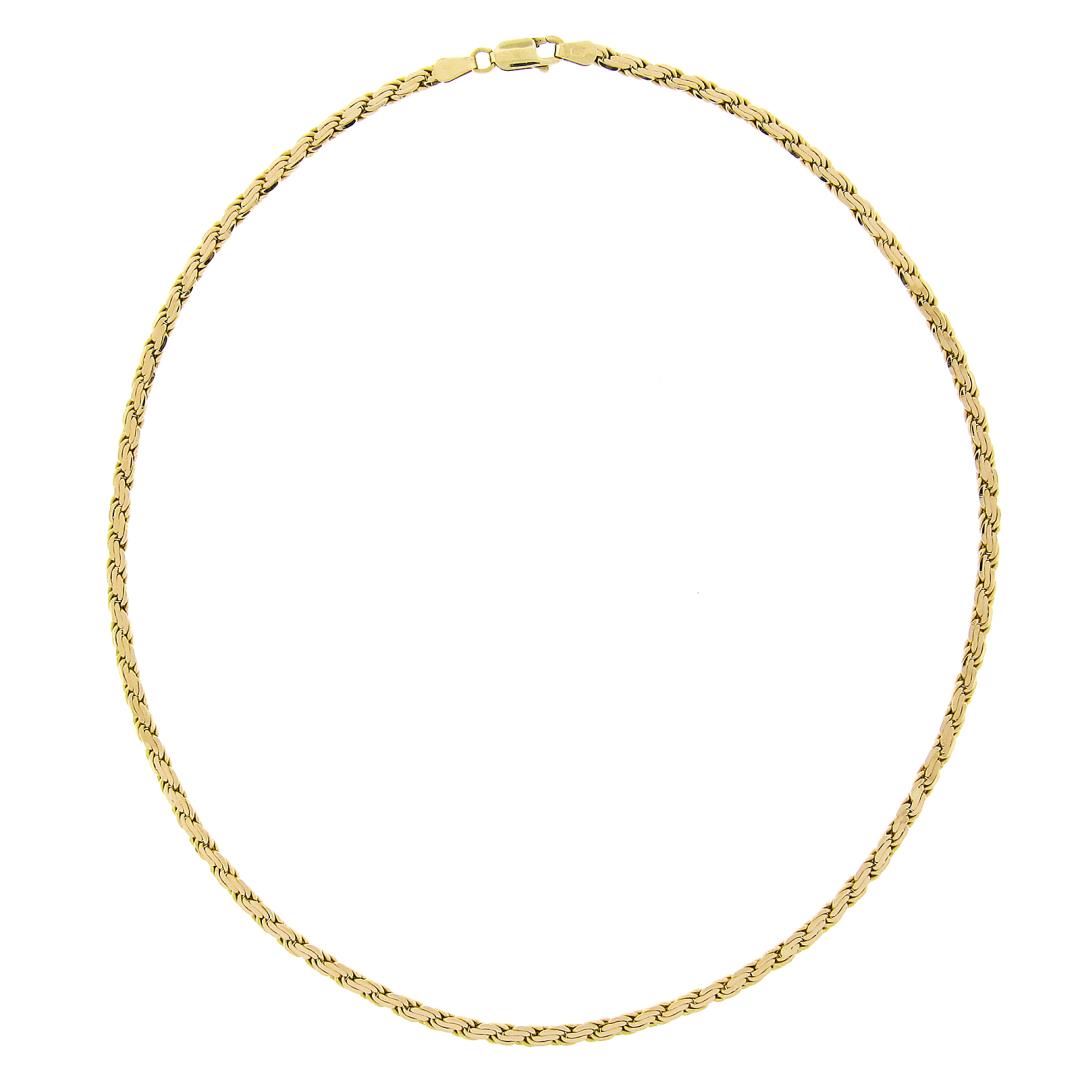A solid 14k yellow gold italian rope link chain. It weighs a total of 16.84 grams, measures 3.2mm wide, and measures 17 inches in length.