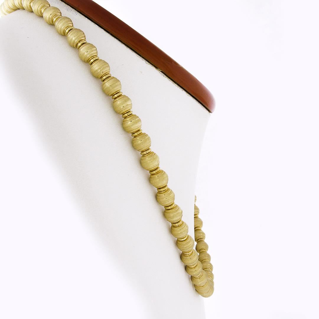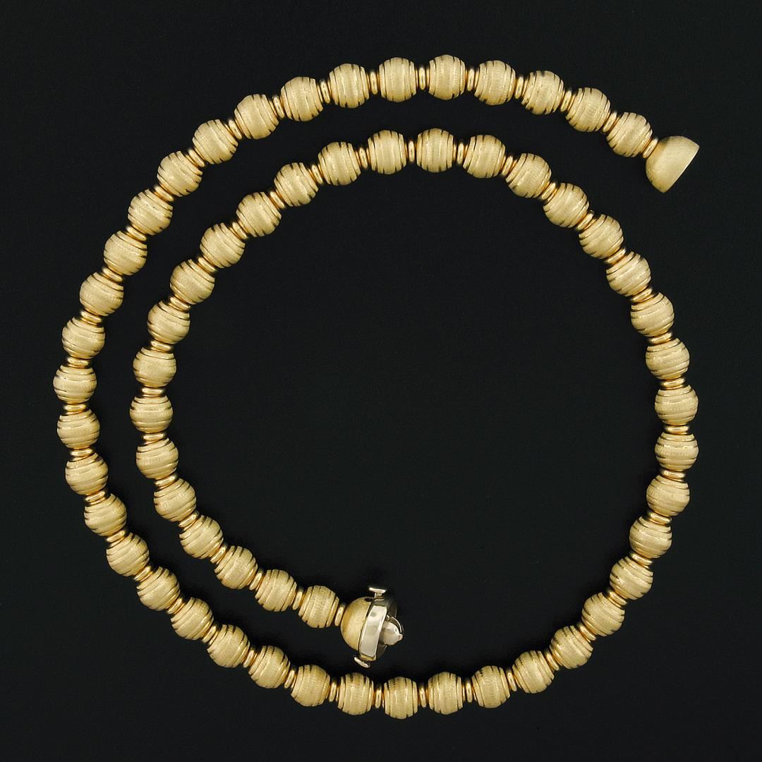 A solid 18k yellow gold beaad necklace. It weighs a total of 30.57 grams, measures 6mm wide, and measure 16 inches in length.