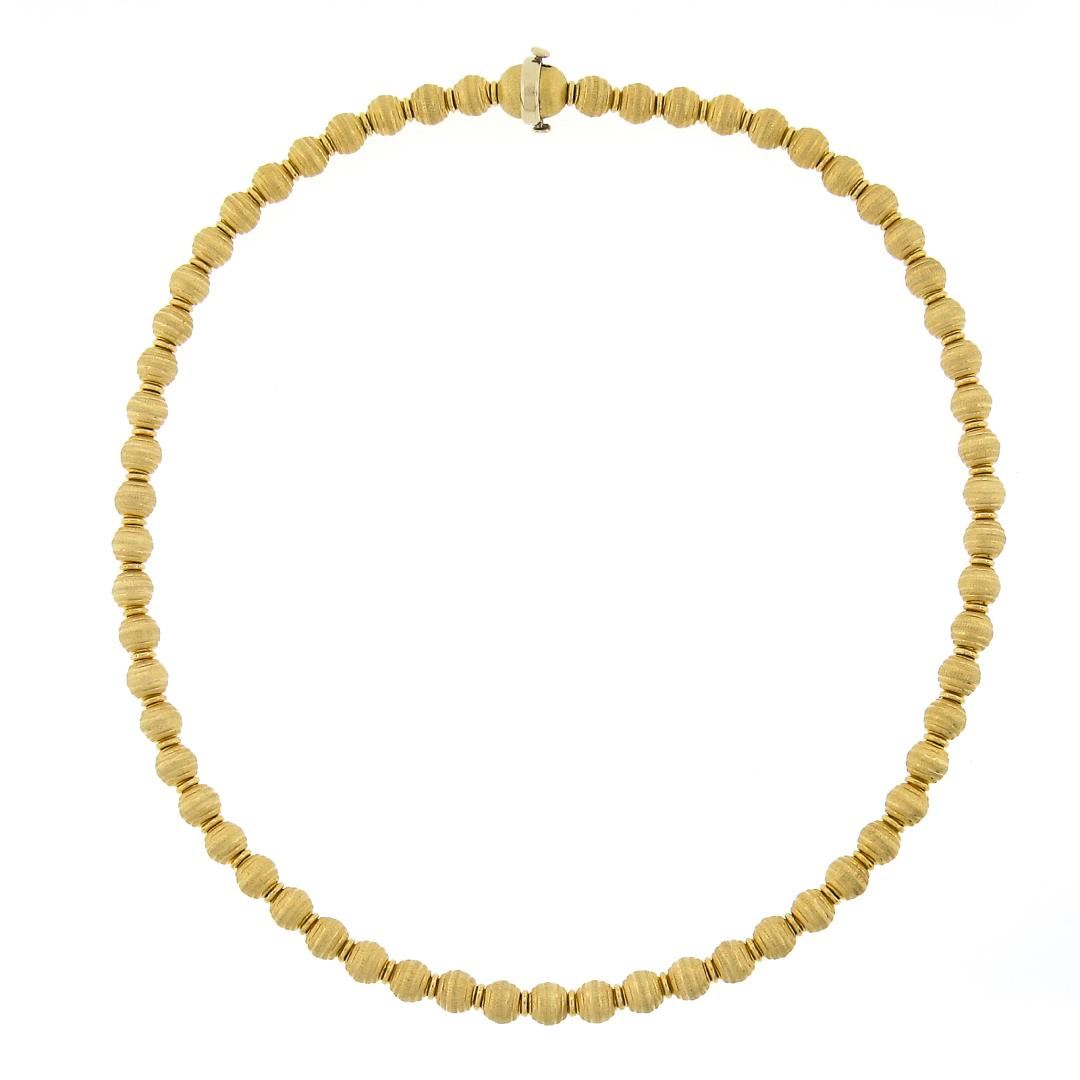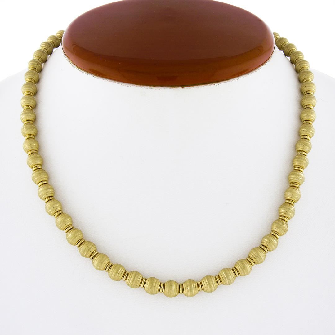 A solid 18k yellow gold beaad necklace. It weighs a total of 30.57 grams, measures 6mm wide, and measure 16 inches in length.