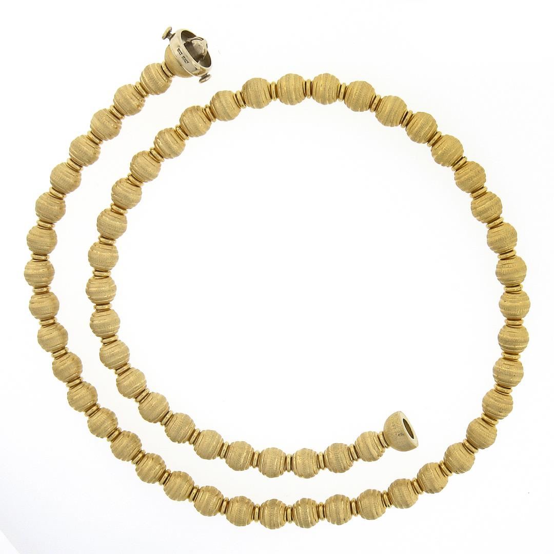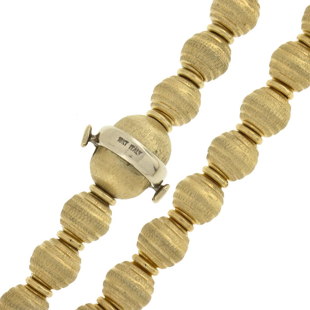 A solid 18k yellow gold beaad necklace. It weighs a total of 30.57 grams, measures 6mm wide, and measure 16 inches in length.