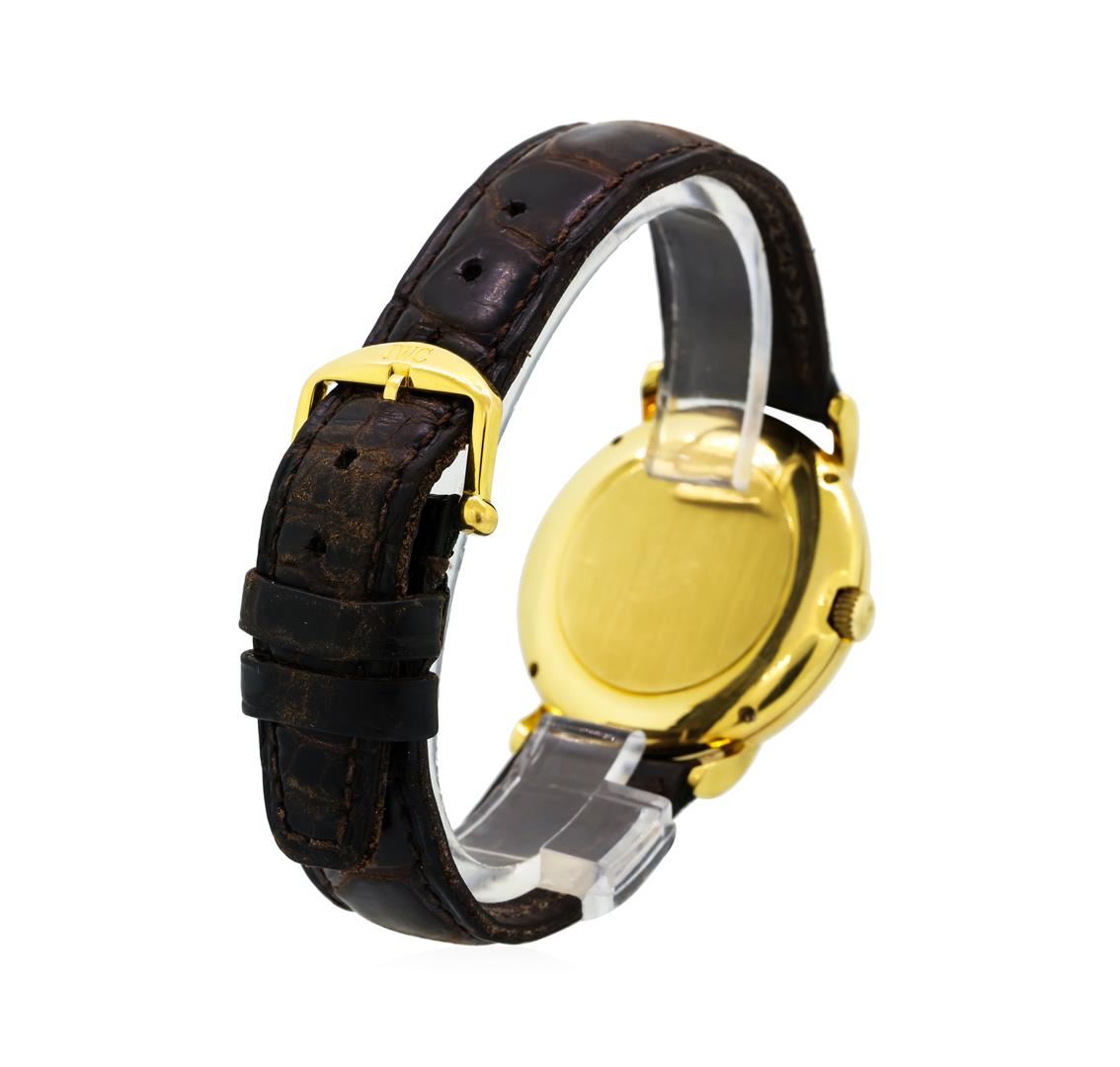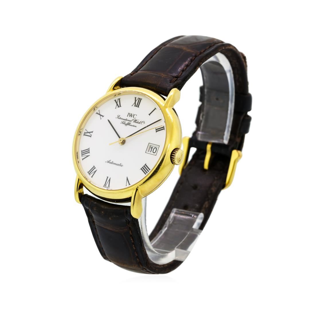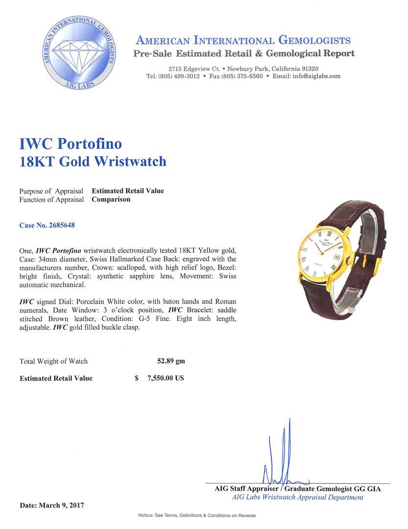 One, IWC Portofino wristwatch electronically tested 18KT Yellow gold, Case: 34mm diameter, Swiss Hallmarked Case Back: engraved with the manufacturers number, Crown: scalloped, with high relief logo, Bezel: bright finish, Crystal: synthetic sapphire lens, Movement: Swiss automatic mechanical. IWC signed Dial: Porcelain White color, with baton hands and Roman numerals, Date Window: 3 o'clock position, IWC Bracelet: saddle stitched Brown leather, Condition: G-5 Fine. Eight inch length, adjustable. IWC gold filled buckle clasp. Total Weight of Watch 52.89gm. AIG Appraised at $7,550.00.