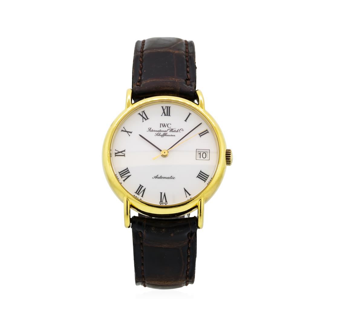 One, IWC Portofino wristwatch electronically tested 18KT Yellow gold, Case: 34mm diameter, Swiss Hallmarked Case Back: engraved with the manufacturers number, Crown: scalloped, with high relief logo, Bezel: bright finish, Crystal: synthetic sapphire lens, Movement: Swiss automatic mechanical. IWC signed Dial: Porcelain White color, with baton hands and Roman numerals, Date Window: 3 o'clock position, IWC Bracelet: saddle stitched Brown leather, Condition: G-5 Fine. Eight inch length, adjustable. IWC gold filled buckle clasp. Total Weight of Watch 52.89gm. AIG Appraised at $7,550.00.
