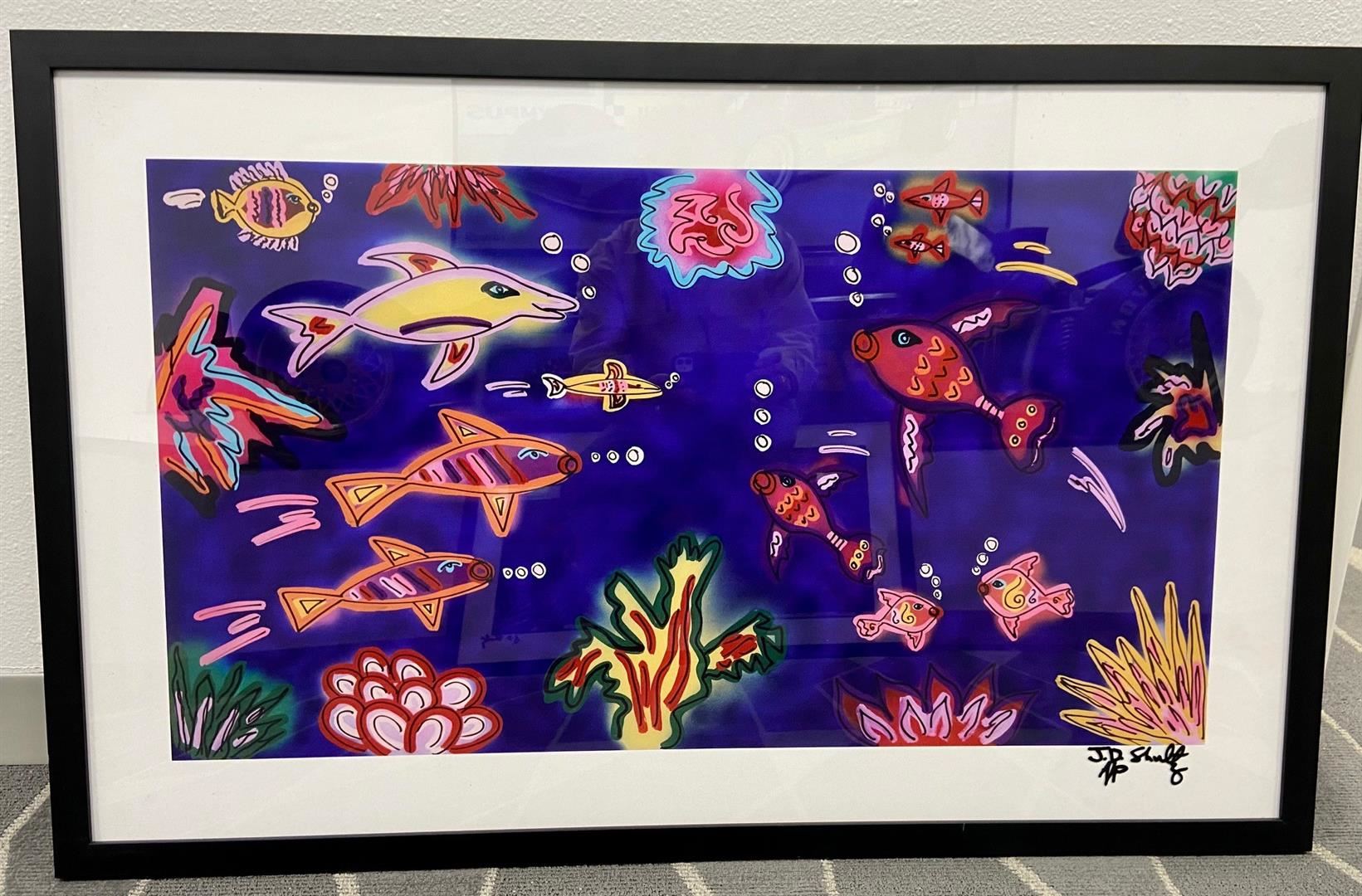 Celebrated artist J.D. Shultz's 28x44" Fishes 1. Framed giclee on plexi, signed, numbered AP.