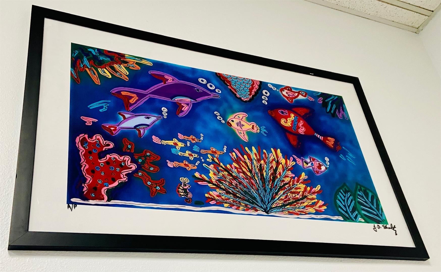 Celebrated artist J.D. Shultz's 28x44" Fishes 2. Framed giclee on plexi, signed, numbered AP.