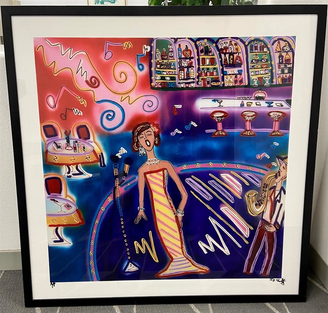 Celebrated artist J.D. Shultz's 44x44" Songstress. Framed giclee on plexi, signed, numbered AP.