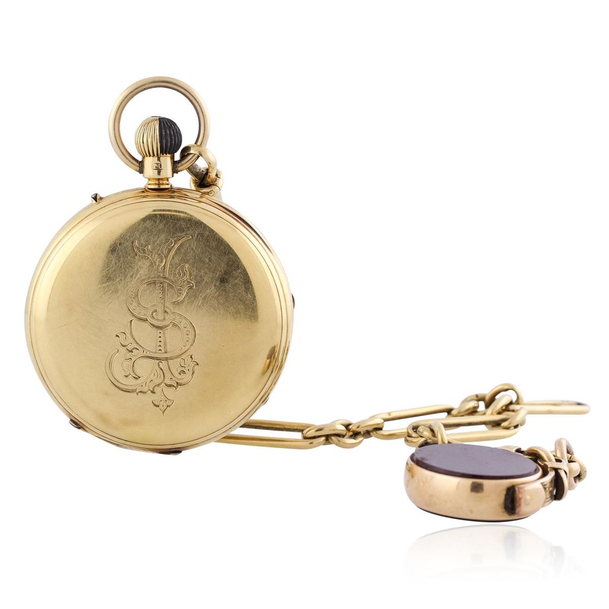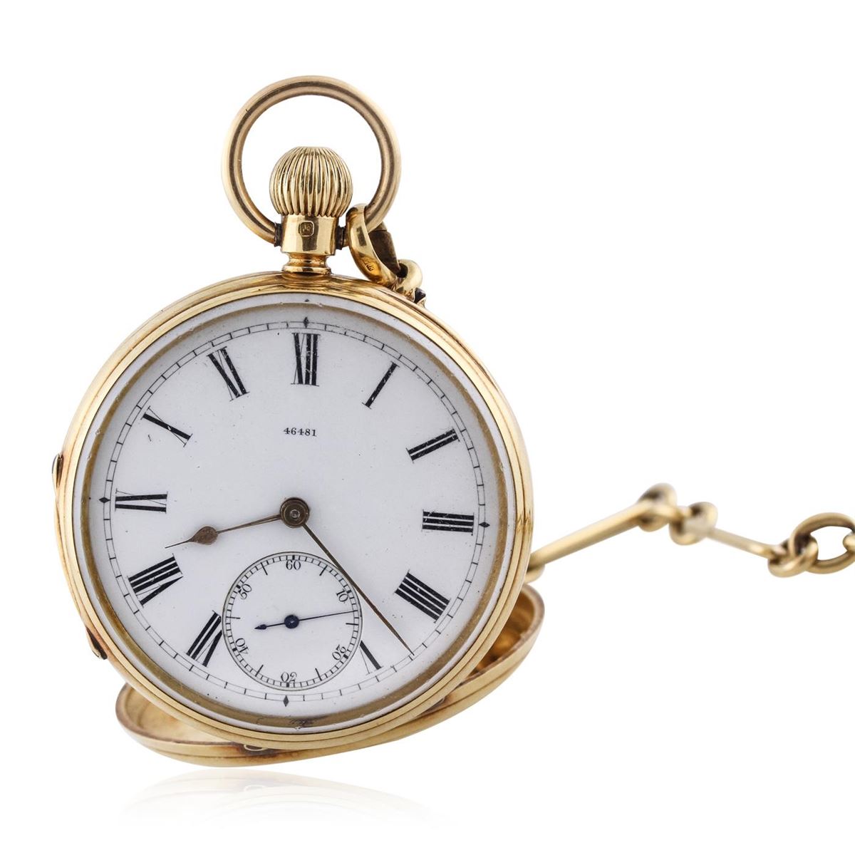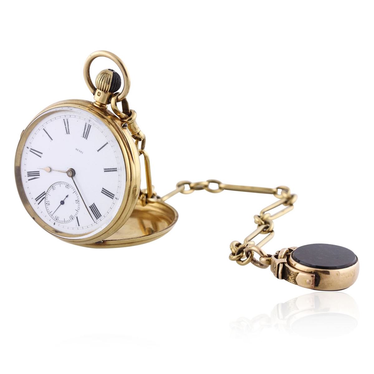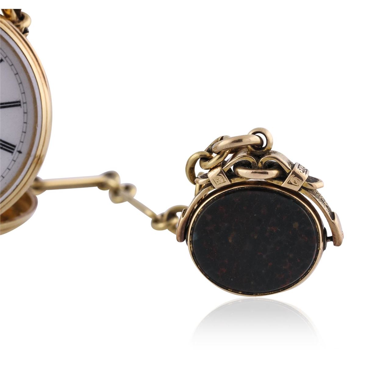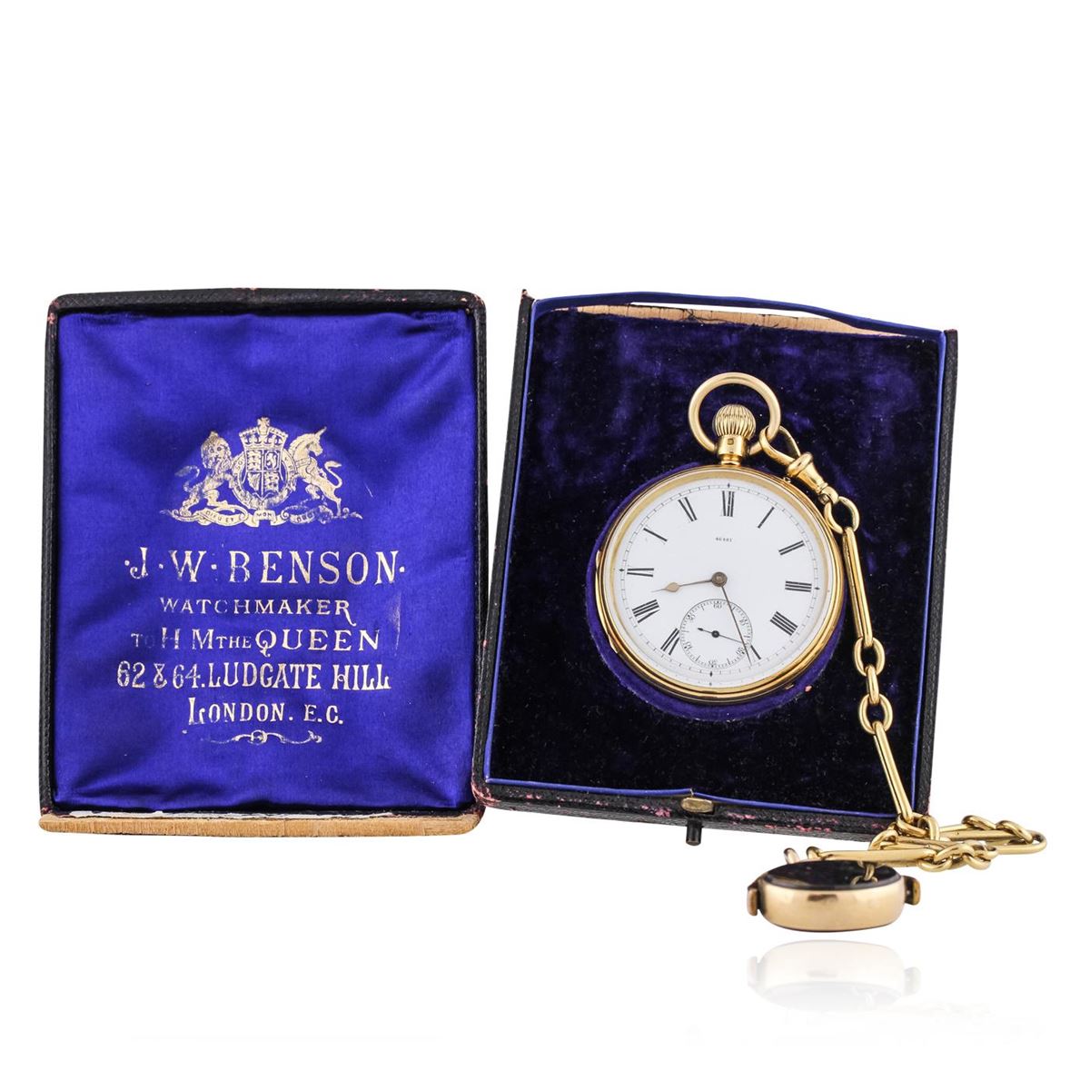 One JW Benson pocket watch featuring: 18KT Yellow Gold case and bezel, Safety Chain, white dial with analog display, roman numerals, subdial at 6 o'clock position.