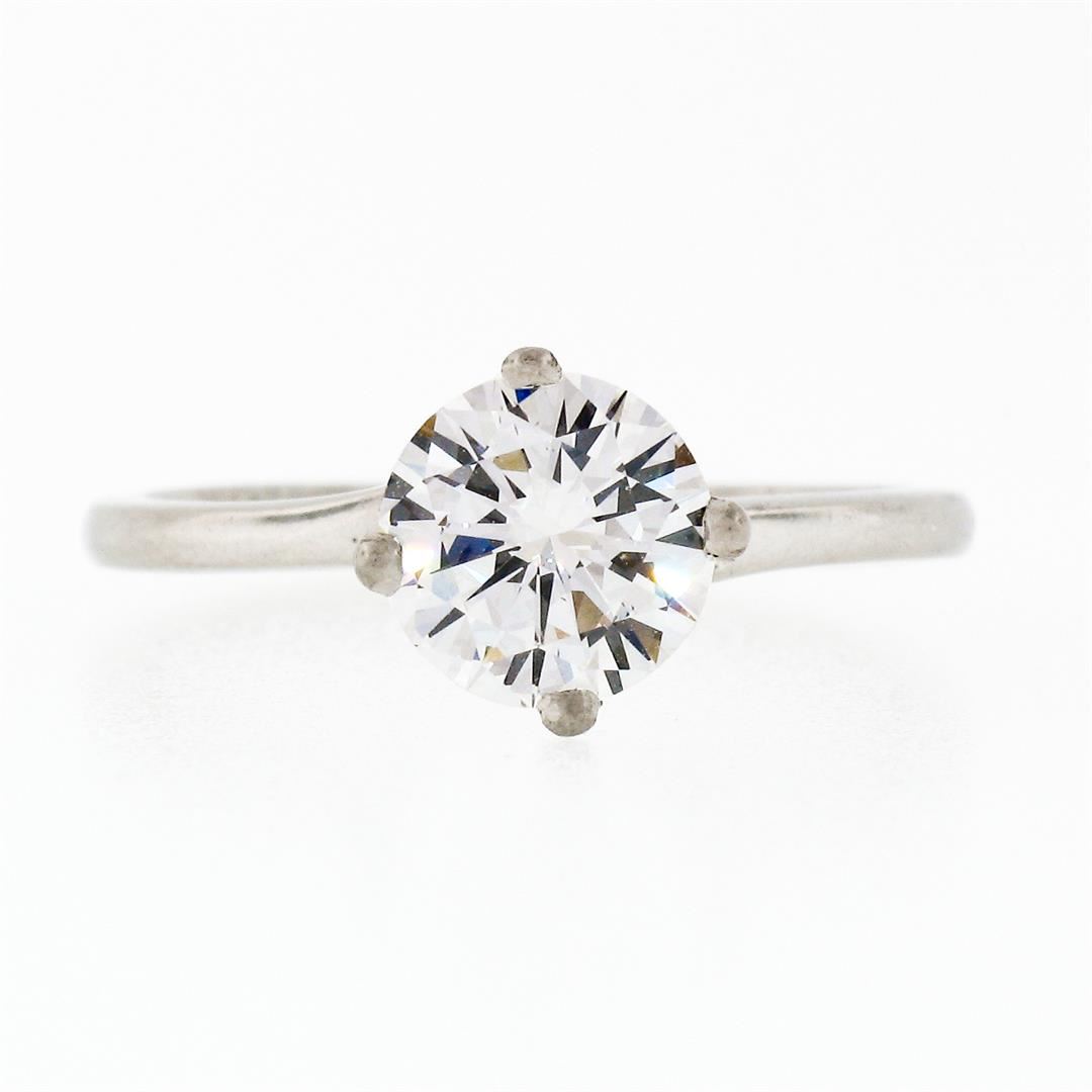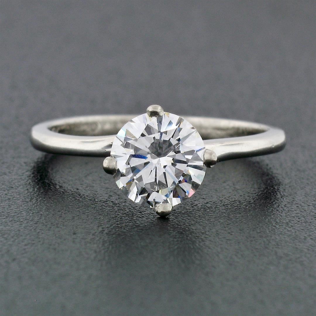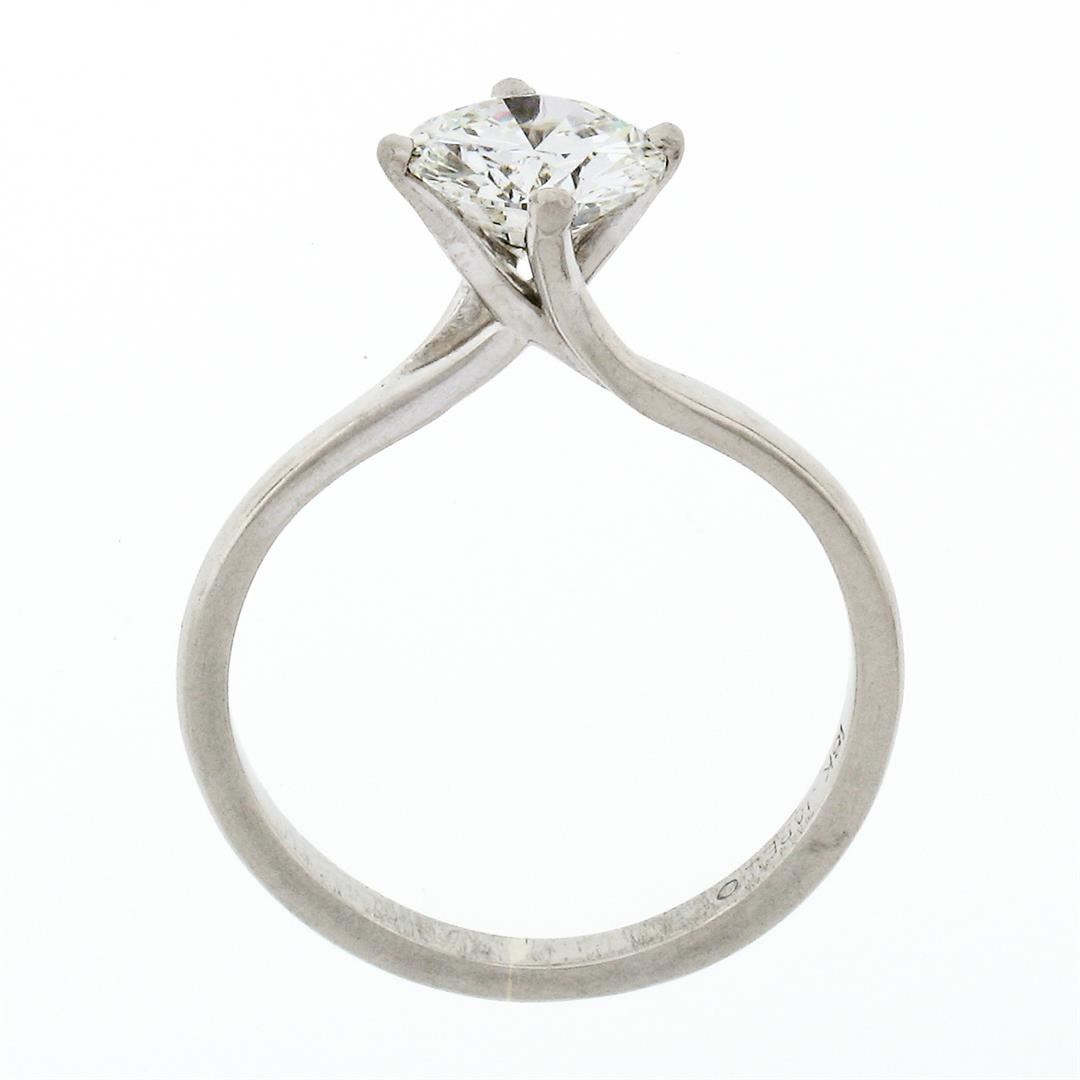 An estate solid 18k white gold engagement ring by Jabel, with 1 Gia certified round brilliant cut natural diamond (E - SI2; 1.02ct). The ring is size 5.25, weighs a total of 2.32 grams, and measures 7.71mm wide. Comes with all original relevant certifications.
