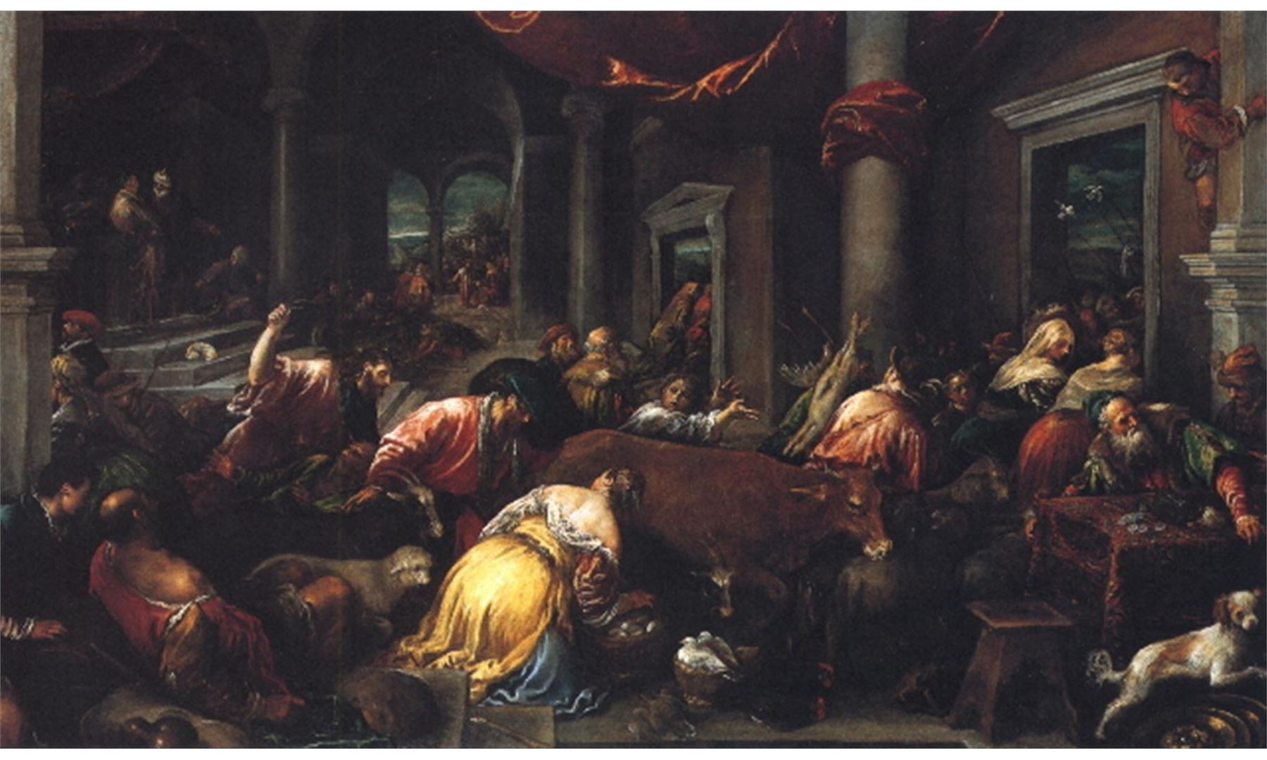 Artist: Jacopo Bassano - Title: Christ Drives the Dealers from the Temple - Medium: Fine Art Giclee on Canvas - Image Size: Approximately 32 inches x 18.75 inches - Unframed on Unstretched Canvas - Biography: Jacopo Bassano (c. 1510 - 14 February 1592), known also as Jacopo dal Ponte, was an Italian painter who was born and died in Bassano del Grappa near Venice, and took the village as his surname. Trained in the workshop of his father, Francesco the Elder, and studying under Bonifazio Veronese in Venice, he painted mostly religious paintings including landscape and genre scenes. He often treated biblical themes in the manner of rural genre scenes, portraying people who look like local peasants and depicting animals with real interest.Bassano's pictures were very popular in Venice because of their depiction of animals and nocturnal scenes