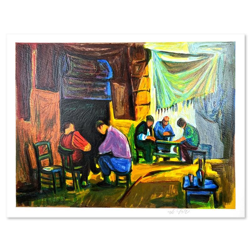 "Jaffa Cafe" is a limited edition on paper by Avi Schwartz. The piece comes hand signed by the artist numbered and with a letter of authenticity. Measures approximately 10" x 15".