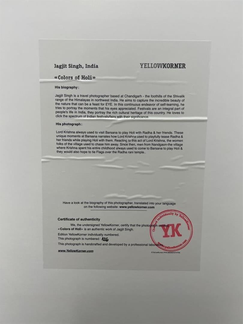 Jagjit Singh India Color Of Holi YellowKorner Certified Photograph. Certificate of Authenticity from YellowKorner affixed to the back. Matted Dimensions 16"x20". Protected with Clear Mylar Sleeve.