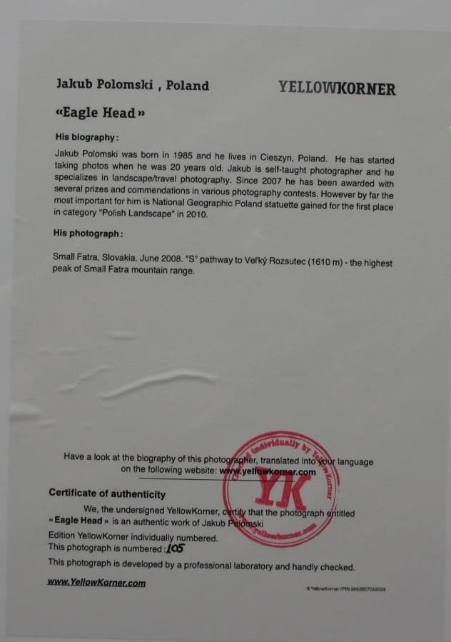 Eagle Head Certified Photograph, Jakub Polomski YellowKorner Certified Photograph. Certificate of Authenticity from YellowKorner affixed to the back. Matted Dimensions 16"x20". Protected with Clear Mylar Sleeve.