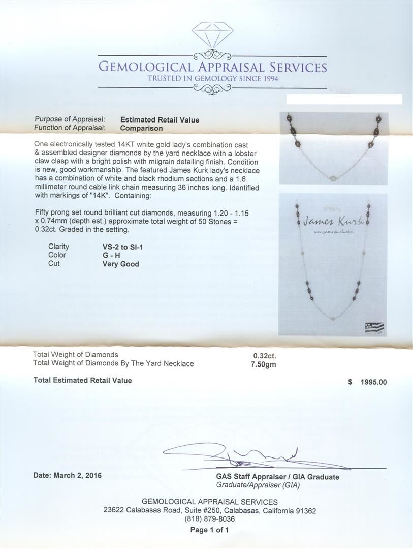 One electronically tested 14KT white gold lady's combination cast & assembled designer diamonds by the yard necklace with a lobster claw clasp with a bright polish with milgrain detailing finish. Condition is new, good workmanship. The featured James Kurk lady's necklace has a combination of white and black rhodium sections and a 1.6 millimeter round cable link chain measuring 36 inches long. Identified with markings of "14K". Containing: Fifty prong set round brilliant cut diamonds, measuring 1.20 - 1.15 x 0.74mm (depth est.) approximate total weight of 50 Stones = 0.32ct. Graded in the setting. Clarity: VS-2 to SI-1. Color: G - H. Cut: Very good. Total Weight of Diamonds: 0.32ct. Total Weight of Necklace: 7.50 grams. GAS Appraised at $1,995.00.