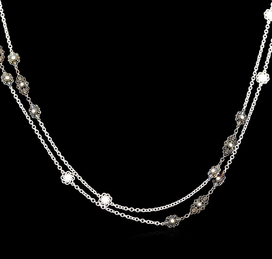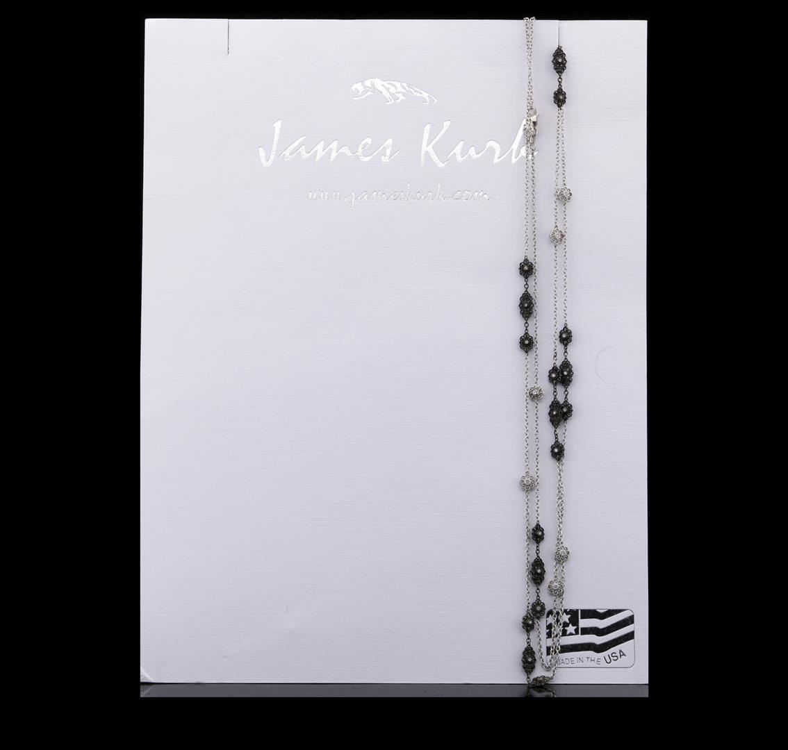 One electronically tested 14KT white gold lady's combination cast & assembled designer diamonds by the yard necklace with a lobster claw clasp with a bright polish with milgrain detailing finish. Condition is new, good workmanship. The featured James Kurk lady's necklace has a combination of white and black rhodium sections and a 1.6 millimeter round cable link chain measuring 36 inches long. Identified with markings of "14K". Containing: Fifty prong set round brilliant cut diamonds, measuring 1.20 - 1.15 x 0.74mm (depth est.) approximate total weight of 50 Stones = 0.32ct. Graded in the setting. Clarity: VS-2 to SI-1. Color: G - H. Cut: Very good. Total Weight of Diamonds: 0.32ct. Total Weight of Necklace: 7.50 grams. GAS Appraised at $1,995.00.